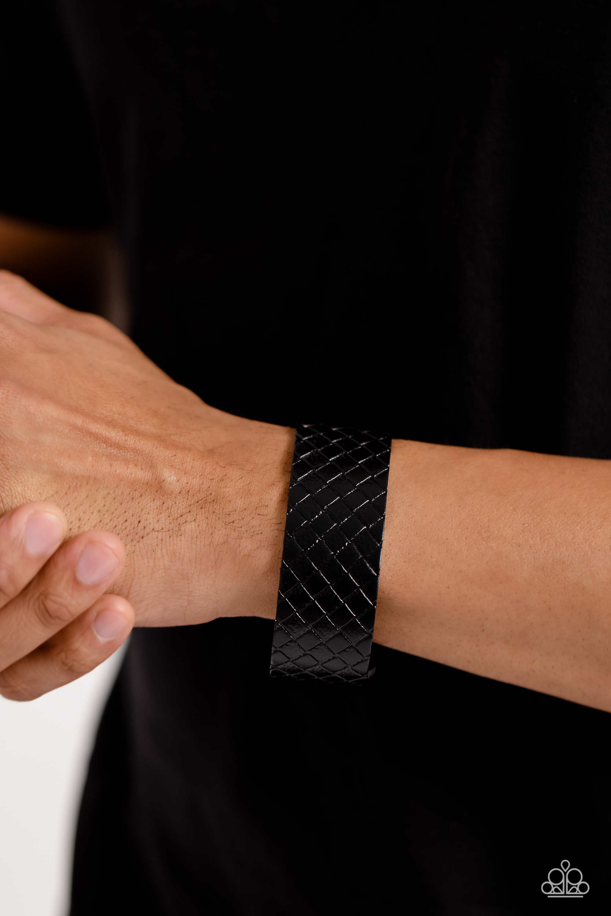 Stamped in a tactile diamond pattern, a shiny piece of shiny black leather wraps around the wrist for a rustic flair. Features an adjustable snap closure.