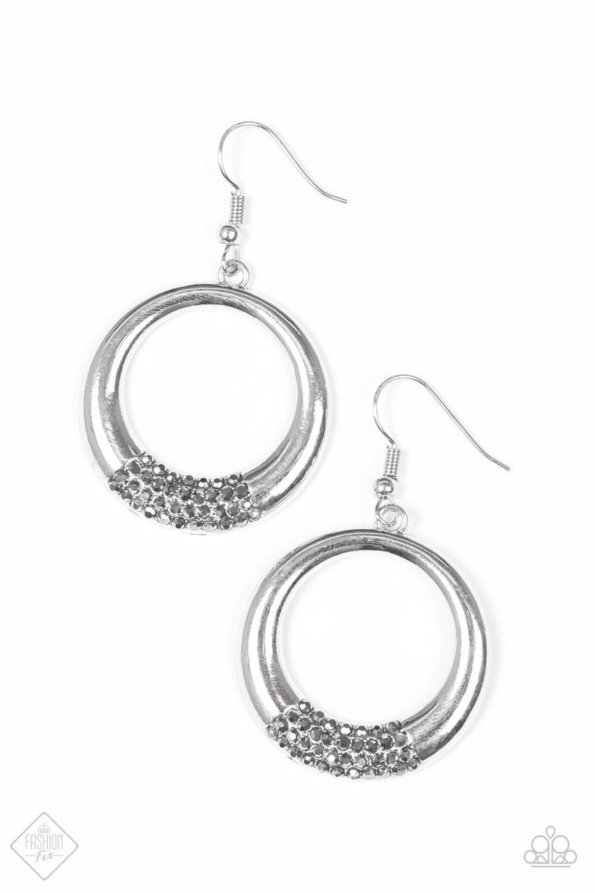 As if dipped in glitter, the bottom of a glistening silver hoop is encrusted in row after row of sparkling hematite rhinestones for an edgy finish.