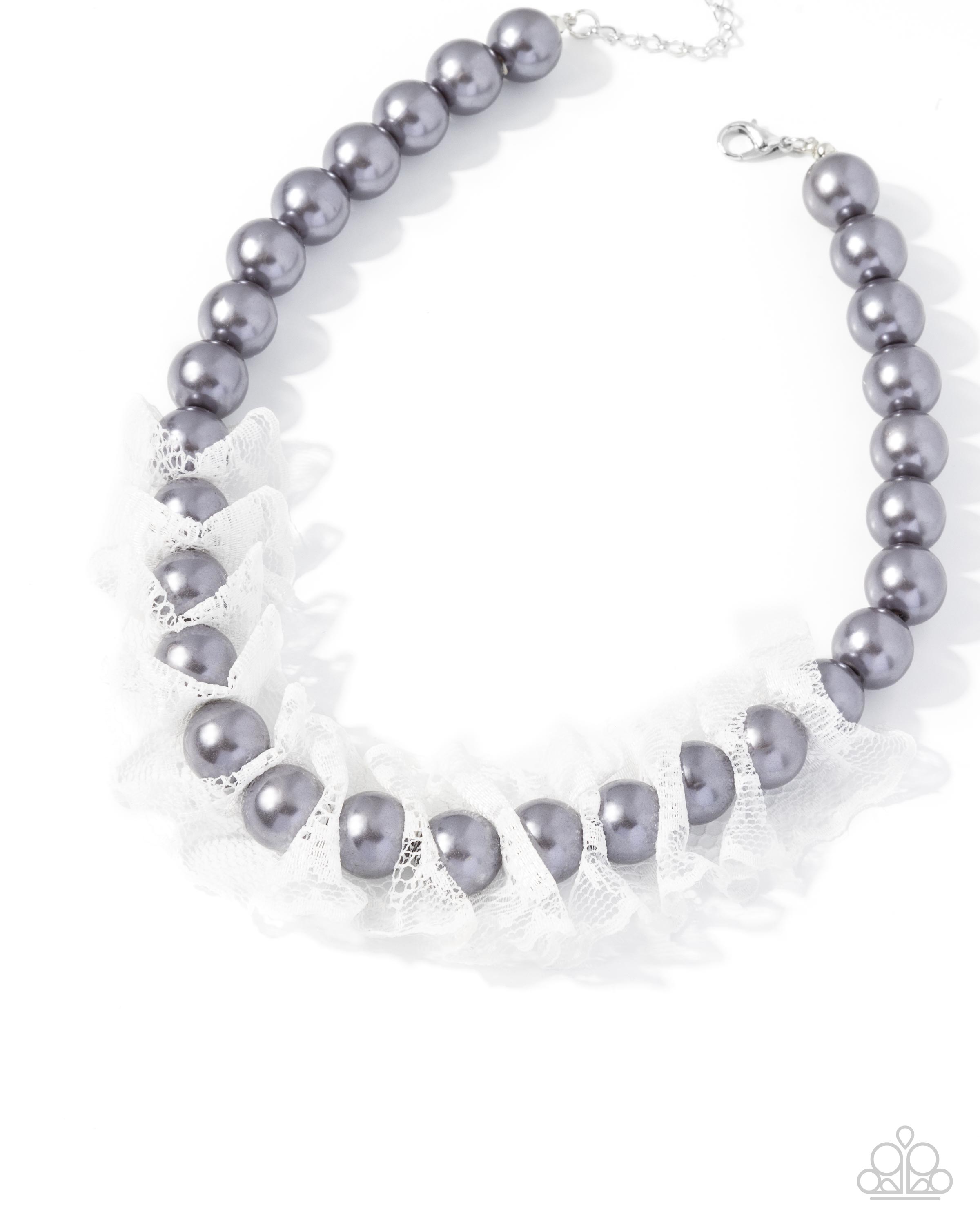 Infused along an invisible string, a collection of high-sheen oversized Dark Gull pearls loop below the neckline for a high-class colorful look. Threaded between the lowermost pearls, a white lacy ribbon stands out for additional feminine flair. Features an adjustable clasp closure.