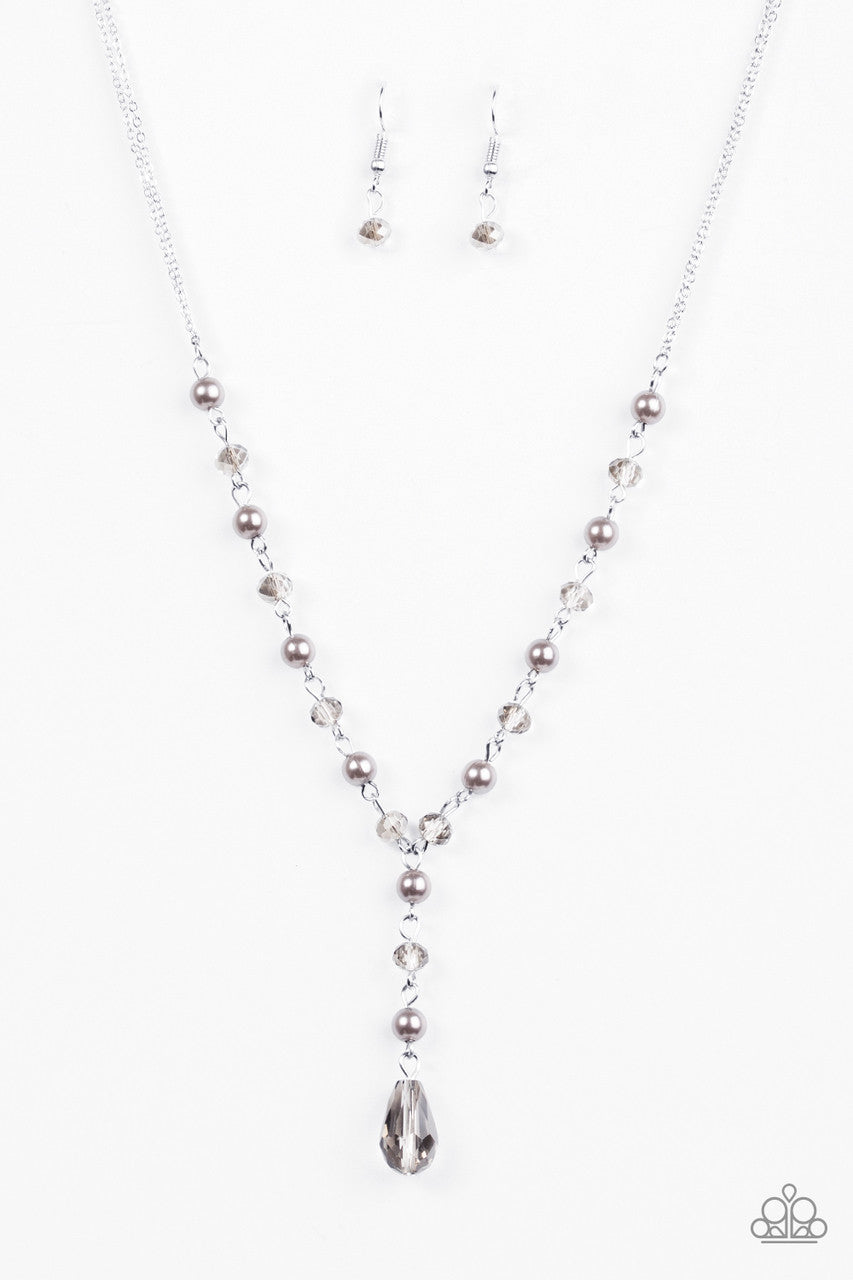 Dainty silver pearls alternate with silver crystal-like beading along a silver chain. An extension of pearls and crystal beading cascades from the chain, giving way to a dramatic teardrop pendant for a vintage inspired look. Features an adjustable clasp closure.