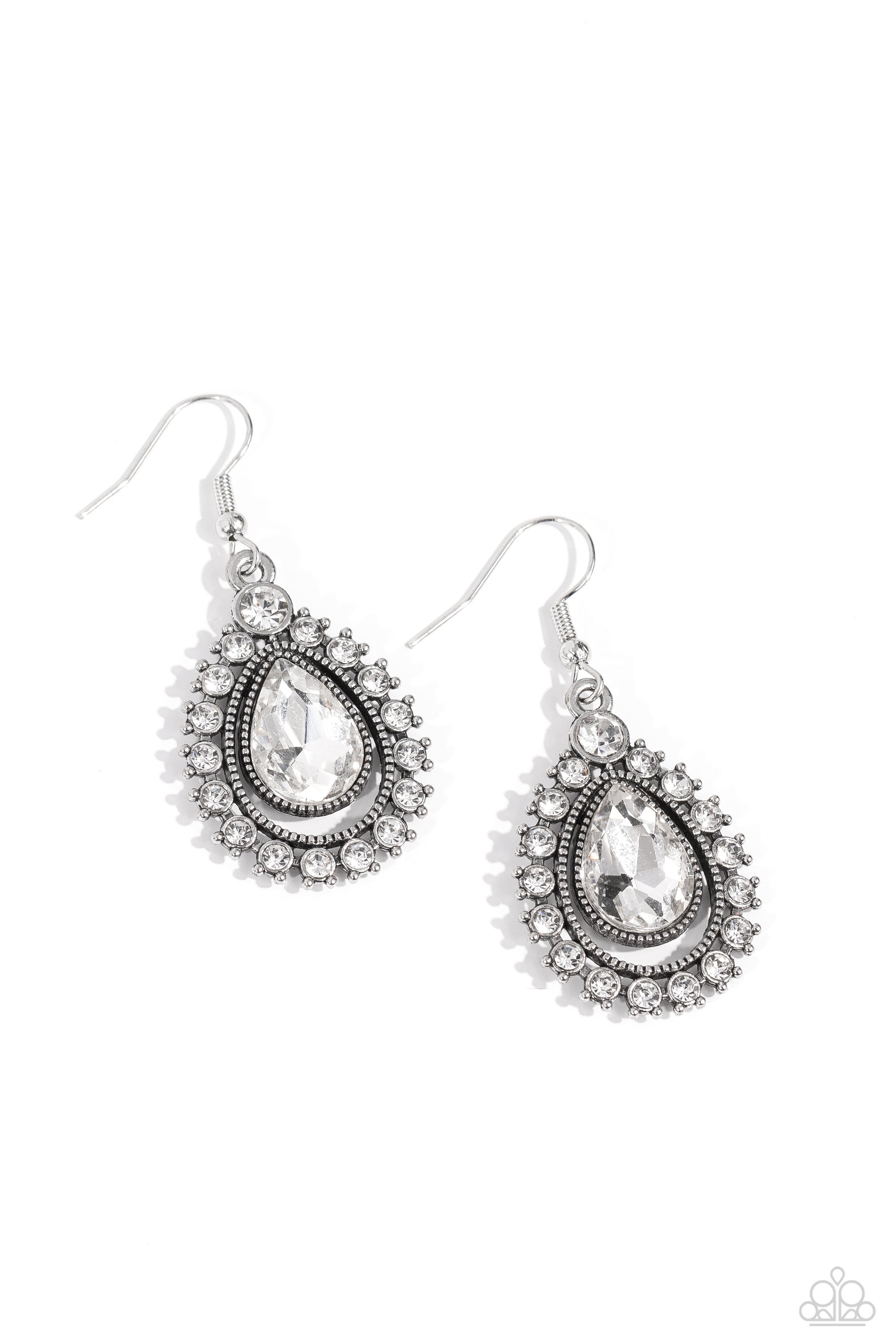 Featuring a silver studded fitting, a glittery white teardrop gem radiates inside of a studded silver teardrop that is bordered in glassy white rhinestones for a glamorous finish. Earring attaches to a standard fishhook fitting.