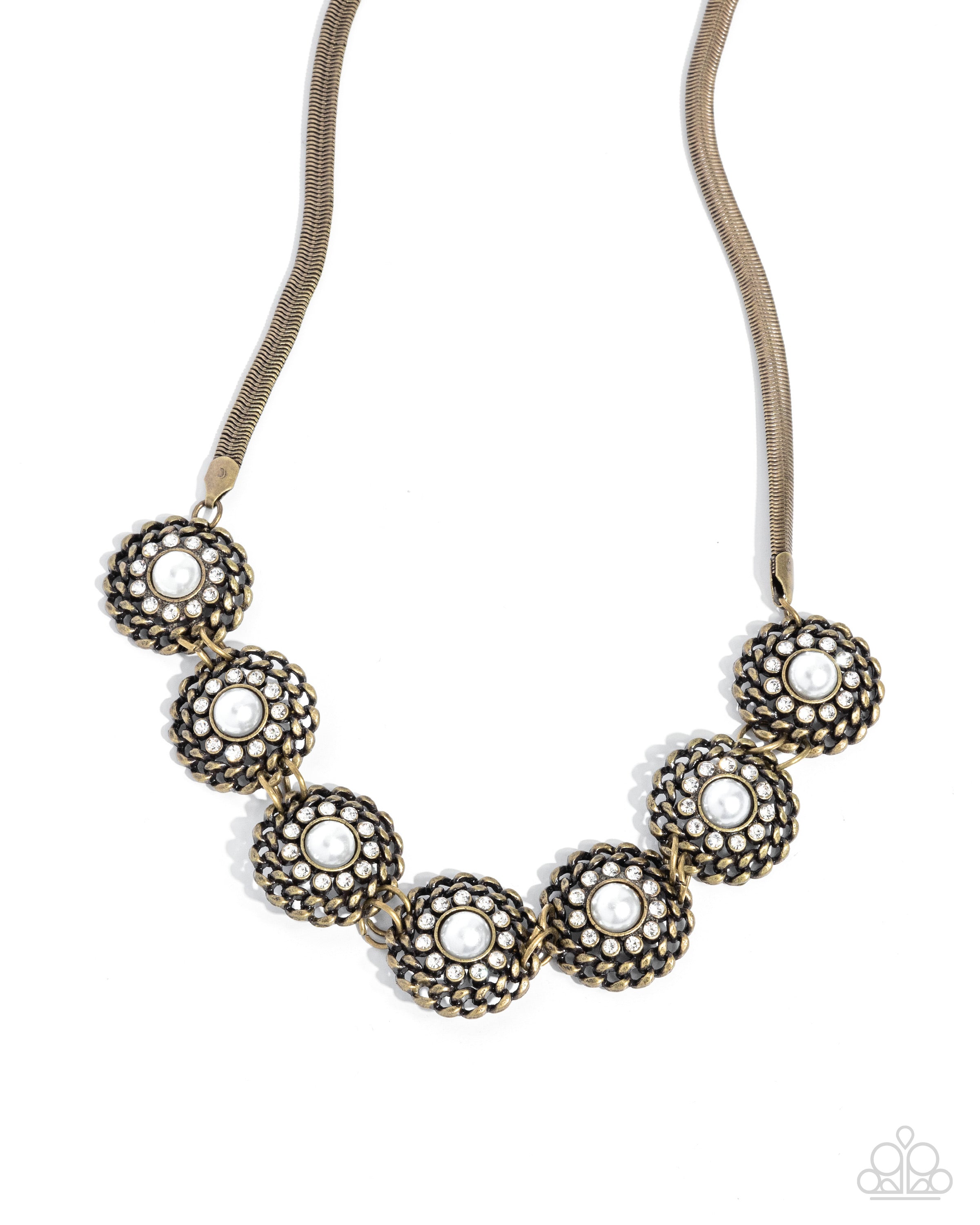 Connecting to a flat brass snake chain, layers of white rhinestones in brass fittings and brass curb chains fan out from white pearl-dotted centers, resulting in radiant centerpieces along the neckline for a flashy, flawless look. Features an adjustable clasp closure.