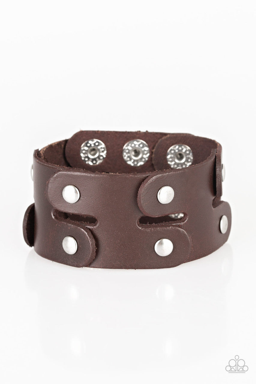 Pieces of shiny brown leather are studded together to create an edgy urban look around the wrist. Features an adjustable snap closure.