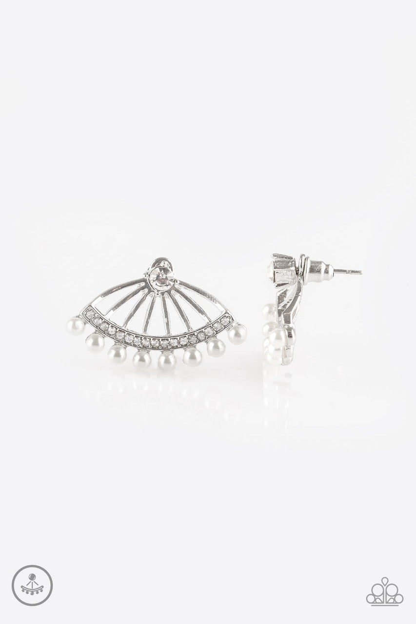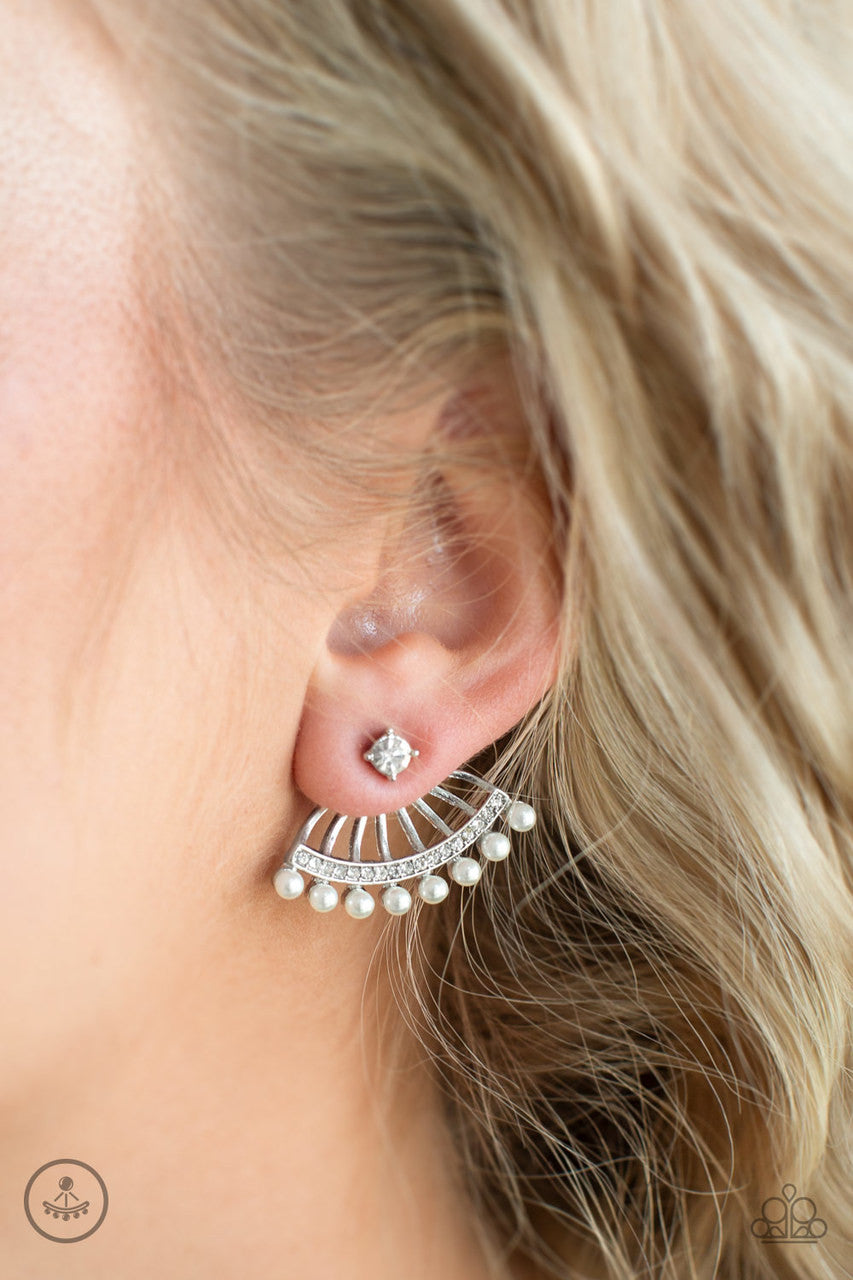 A solitaire white rhinestone attaches to a double-sided post, designed to fasten behind the ear. Encrusted in glassy white rhinestones and dainty white pearls, the double-sided post peeks out beneath the ear, creating a glittery fringe. Earring attaches to a standard post fitting.