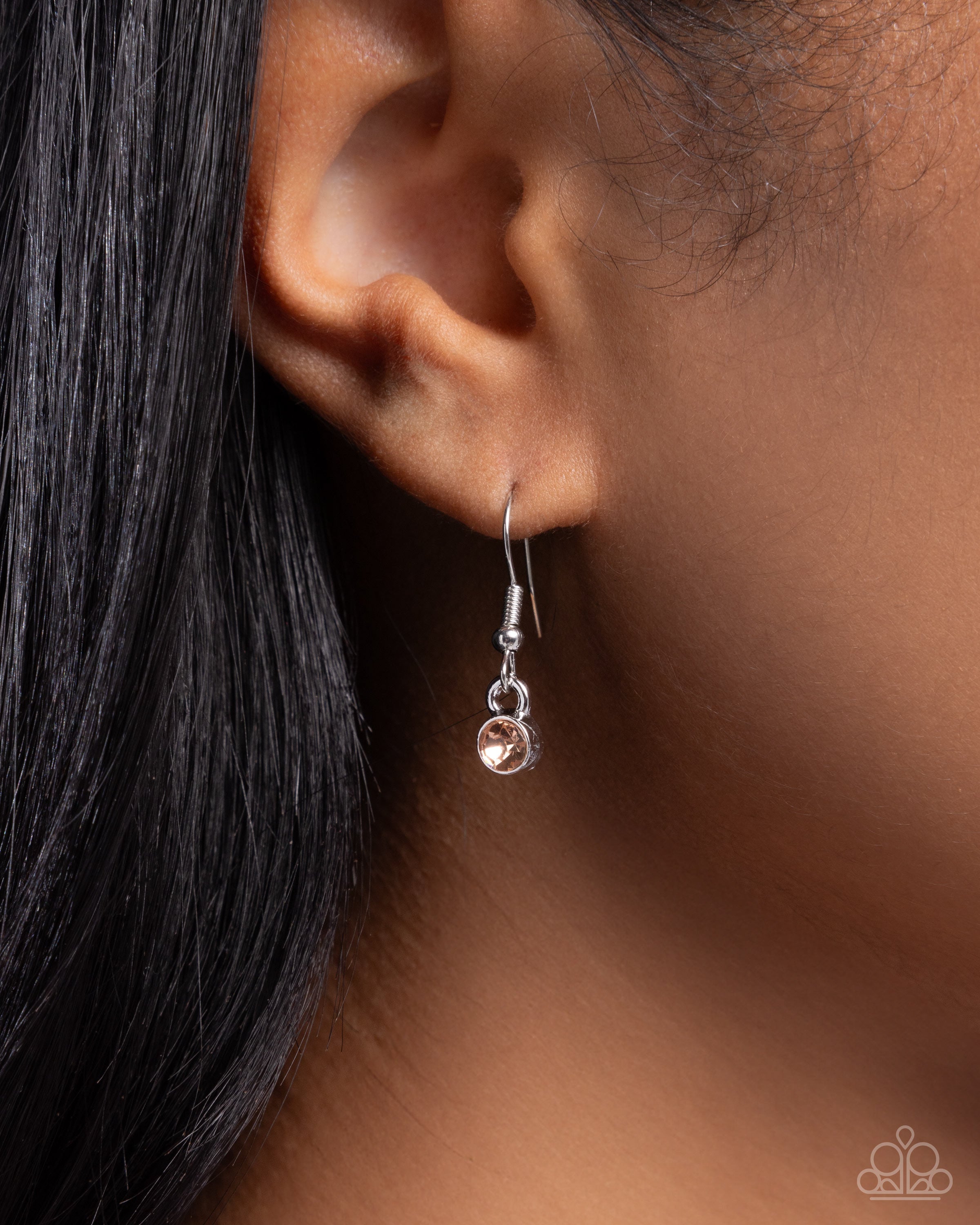 Featuring a dainty rope chain, a sleek silver oval-shaped pendant adorned with two faceted rhinestones rests below the neckline. A larger oval-shaped topaz rhinestone rests near the bottom, while a smaller light peach rhinestone accents the top, creating an elegant and modern design. Features an adjustable clasp closure.