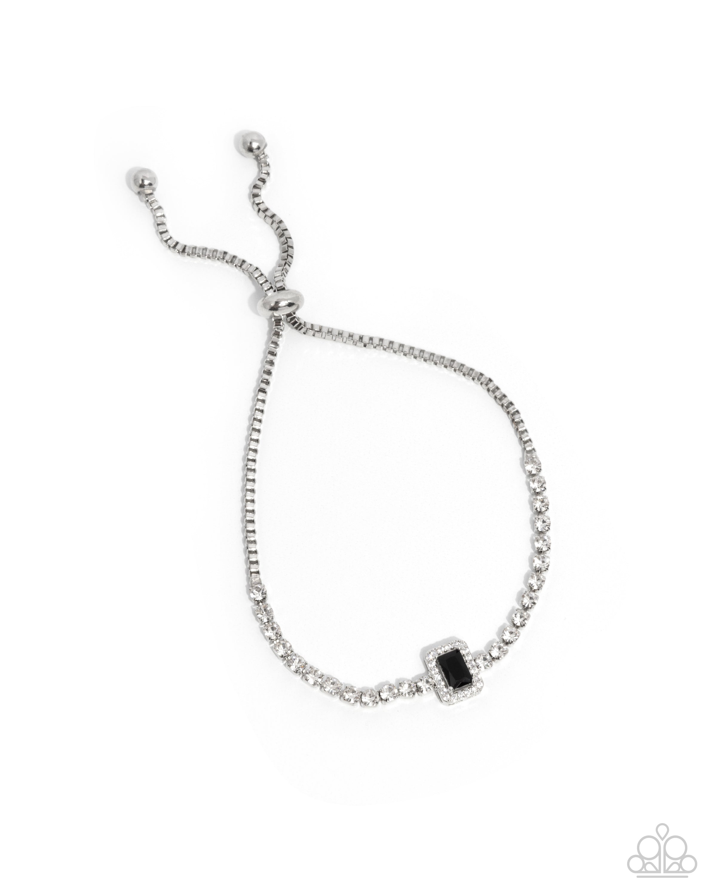 Featuring pronged silver fittings, a strand of faceted white rhinestones connect with a silver box chain around the wrist for a mismatched twist. Pressed in a border of white rhinestones, a jet-black emerald-cut gem glistens from the center of the design for a touch of dynamite dazzle. Features an adjustable clasp closure.