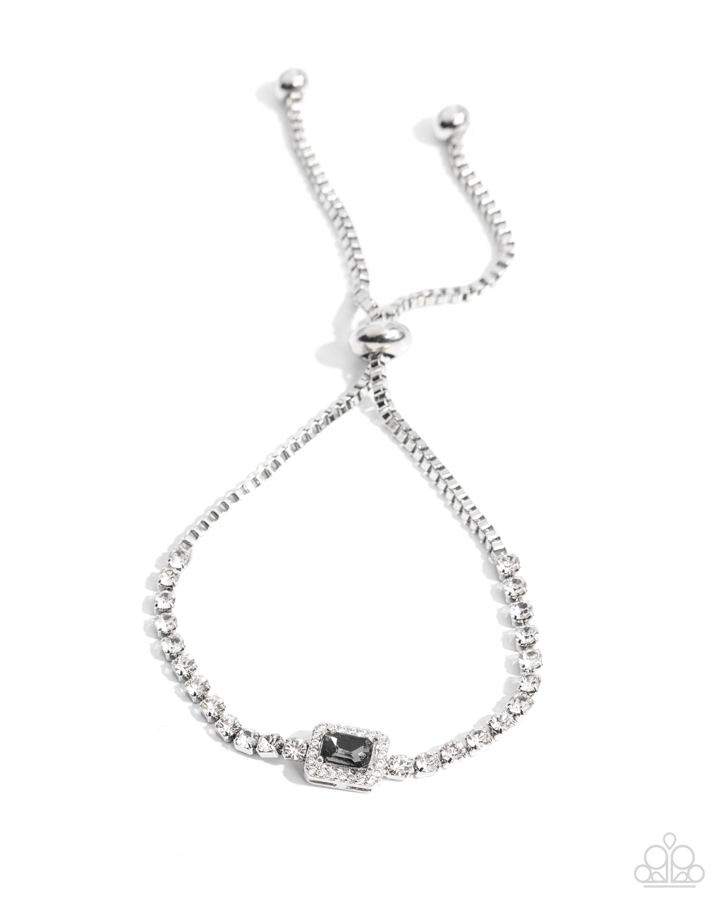 Featuring pronged silver fittings, a strand of faceted white rhinestones connects with a silver box chain around the wrist for a mismatched twist. Pressed in a border of white rhinestones, a smoky emerald-cut gem glistens from the center of the design for a touch of dynamite dazzle. Features an adjustable clasp closure.
