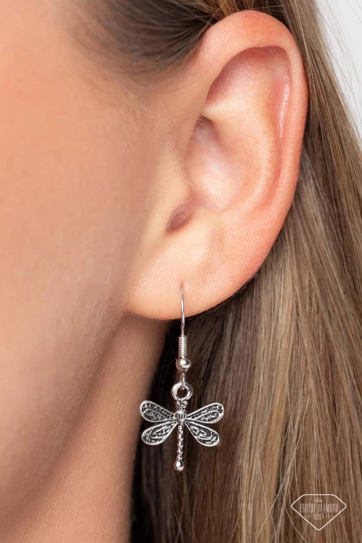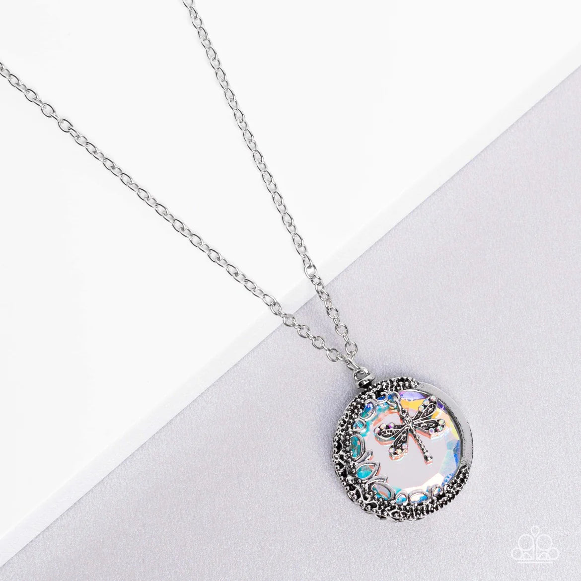 Rich in sentimental character. Its thick circular pendant showcases an enchanting dragonfly charm surrounded by dreamy iridescence, and then dotted with dainty iridescent rhinestones to amplify the shimmer. Silver filigree and a dot motif border one side of the circular design, overlapping on the front side to create whimsical cutouts and add a touch of vintage charm.