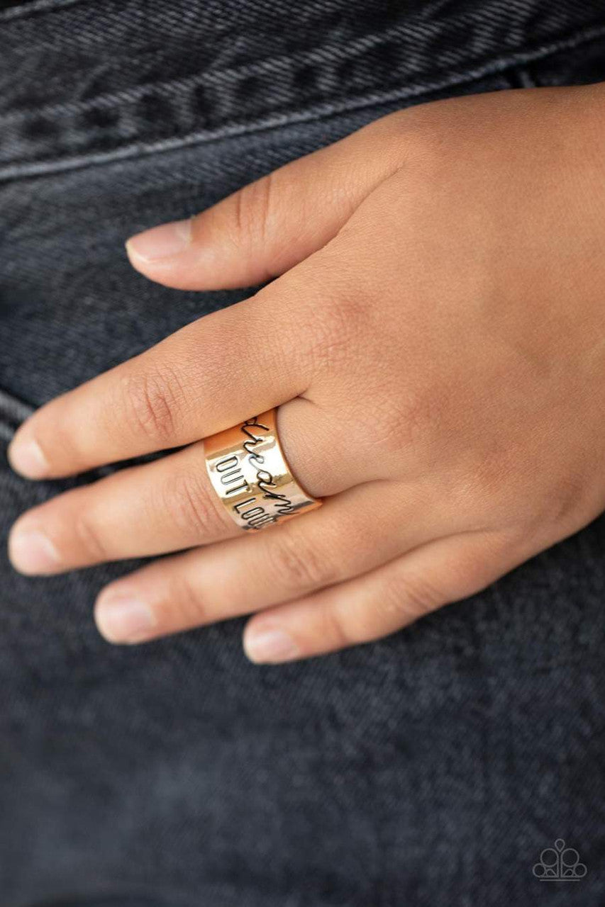The front of a thick gold band is stamped in the phrase, "Dream out loud," creating an inspirational centerpiece across the finger. Features a stretchy band for a flexible fit.