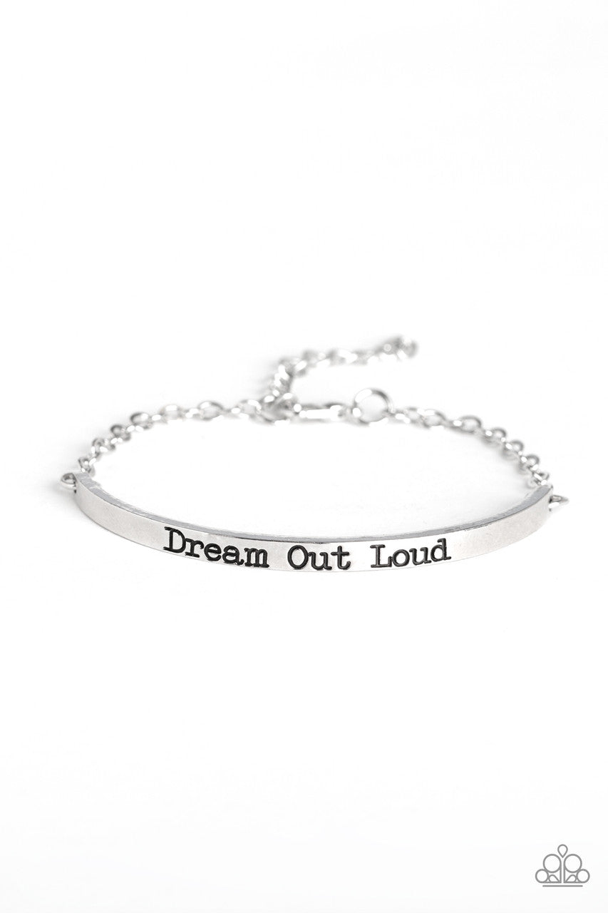 A glistening silver chain attaches to a dainty silver bar stamped in the inspirational phrase, "Dream Out Loud", for a dreamy finish. Features an adjustable clasp closure.