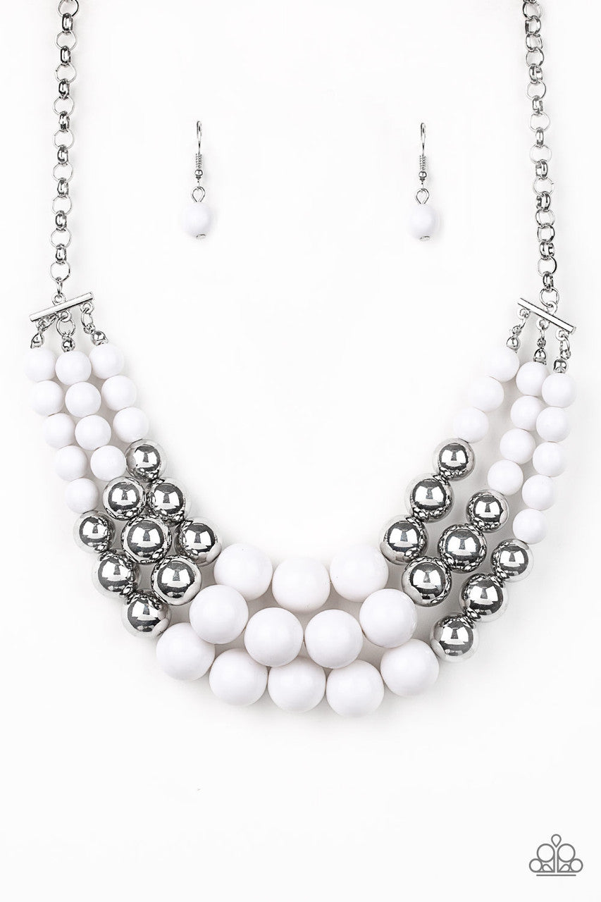 Gradually increasing in size near the center, a collection of white and silver beads layer below the collar in a statement making fashion. Features an adjustable clasp closure.