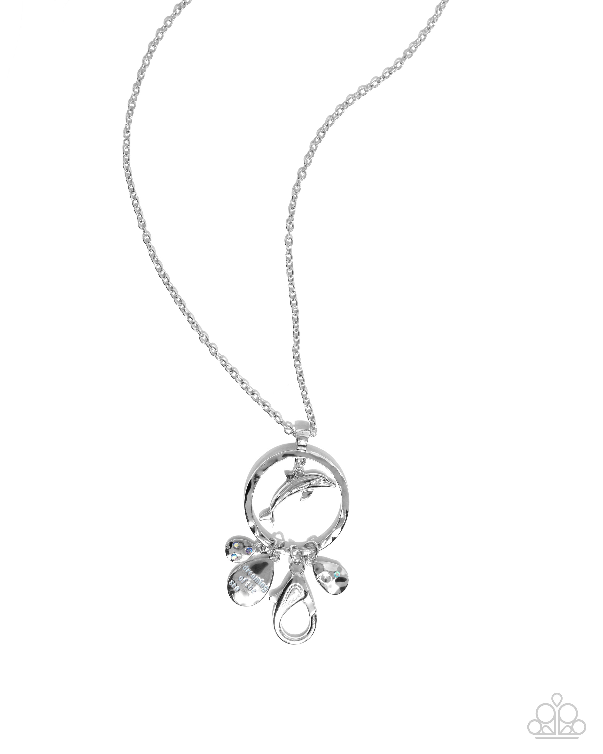 Featuring a warped silver ring, a silver dolphin swings from the bottom of an elongated silver chain, creating an asymmetrical sea-inspired pendant. A duo of hammered silver teardrops, one with blue multicolored and iridescent rhinestones, swings along the exterior of the warped ring. Featuring light blue pearlized paint, the phrase "dreaming of the sea" is set in the center of a larger high-sheen silver teardrop, adding a dash of additional color. A lobster clasp hangs from the bottom of the design to allow a name badge or other item to be attached. Features an adjustable clasp closure.
