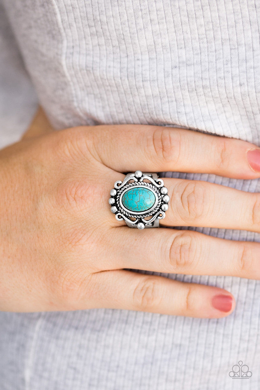 A smooth turquoise stone is pressed into the center of an antiqued silver frame radiating with rustic textures.