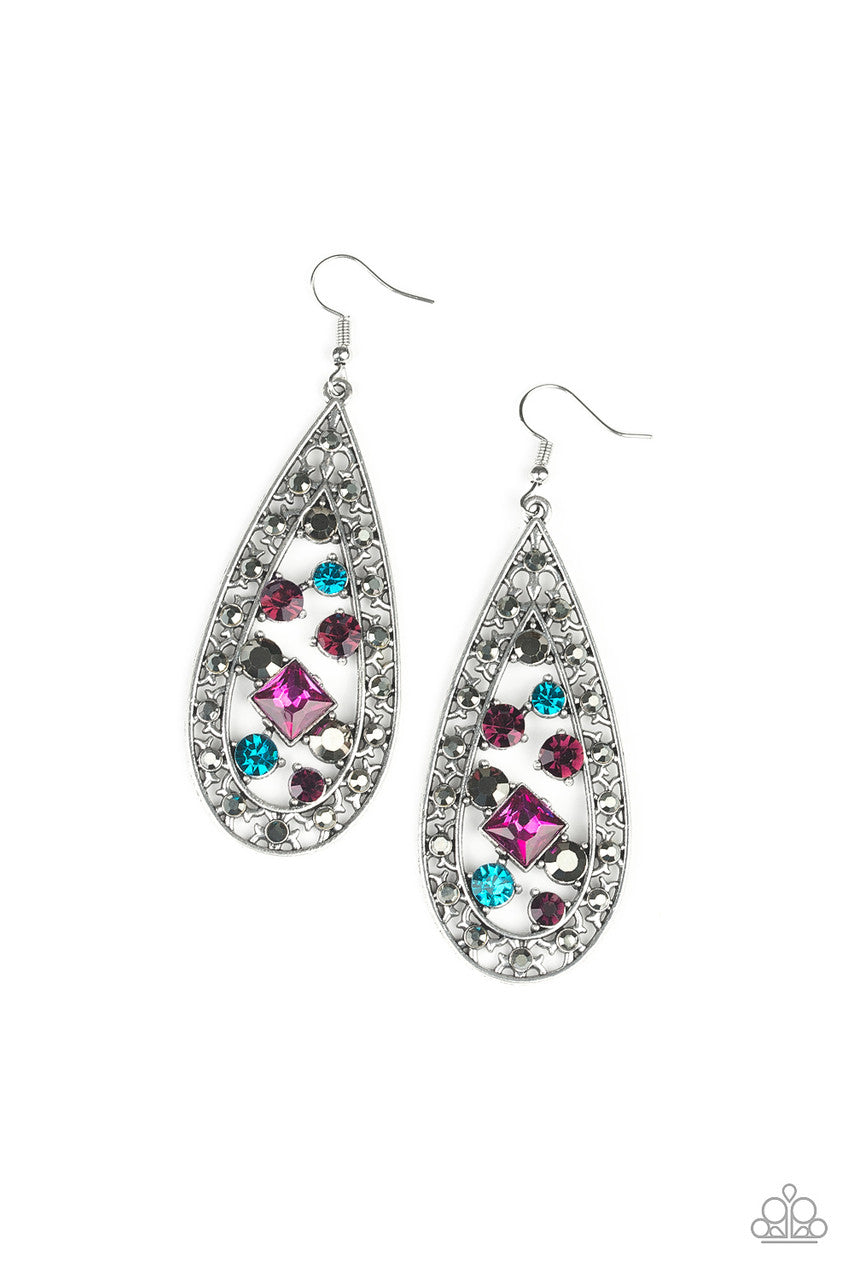 A glassy collection of blue, purple, pink, and hematite rhinestones coalesce inside the center of a hematite rhinestone encrusted silver teardrop for a timeless twist. Earring attaches to a standard fishhook fitting.