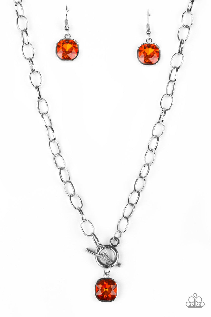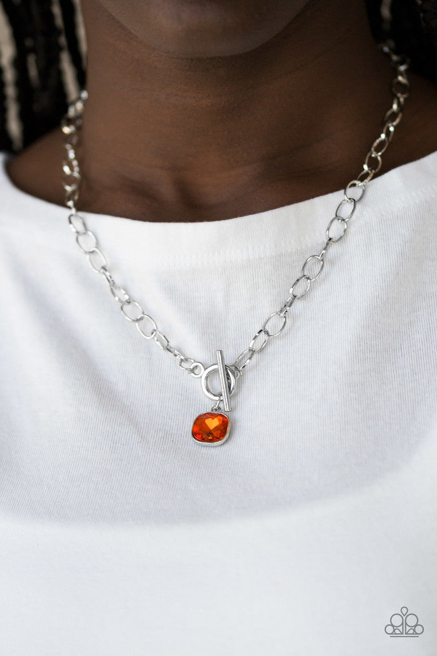 Pressed into a sleek silver frame, a dramatic orange gem swings from the bottom of a glistening silver chain below the collar for a chic look. Features a toggle closure.