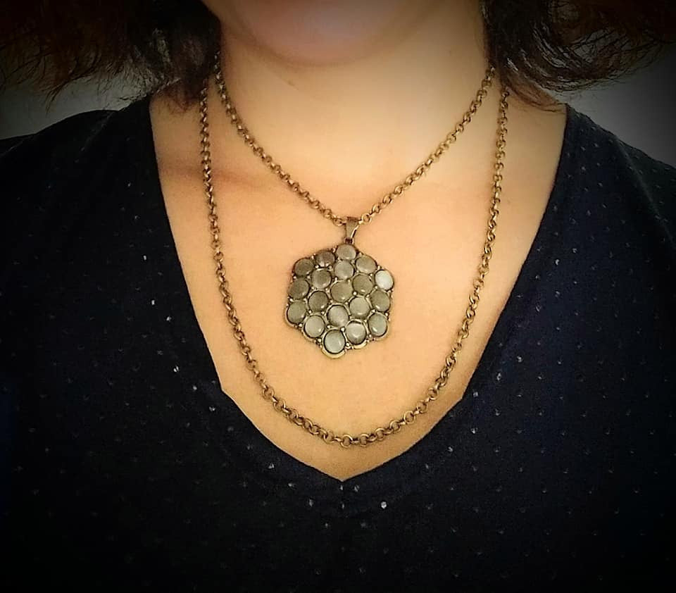 Featuring multiple white moonstones, a hexagon brass pendant swings from a brass chain below the collar for a beehive look. Features an adjustable clasp closure.