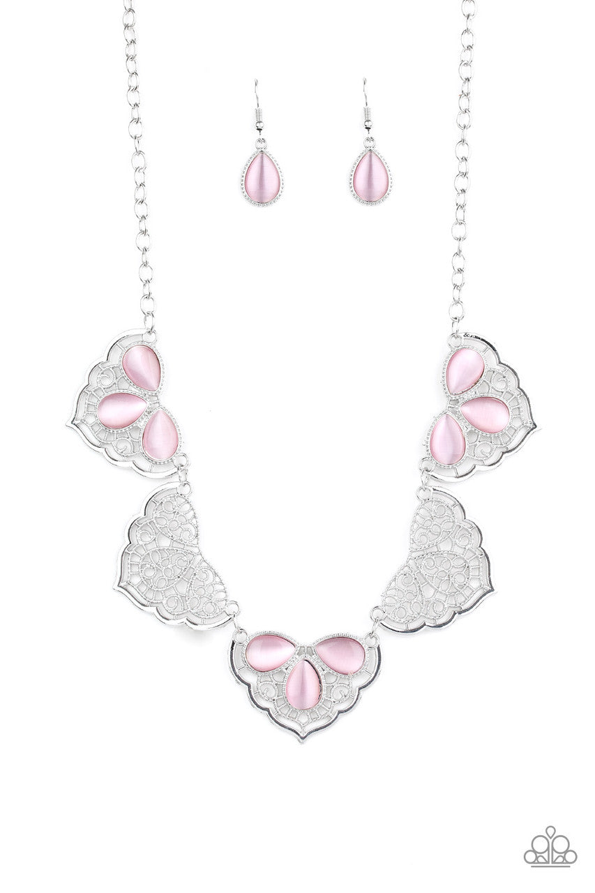 Filled with lacy-like patterns, filigree filled silver frames connect below the collar. Glowing pink teardrop moonstones alternate along the airy frames, adding a refreshing hint of color to the whimsical fringe. Features an adjustable clasp closure.