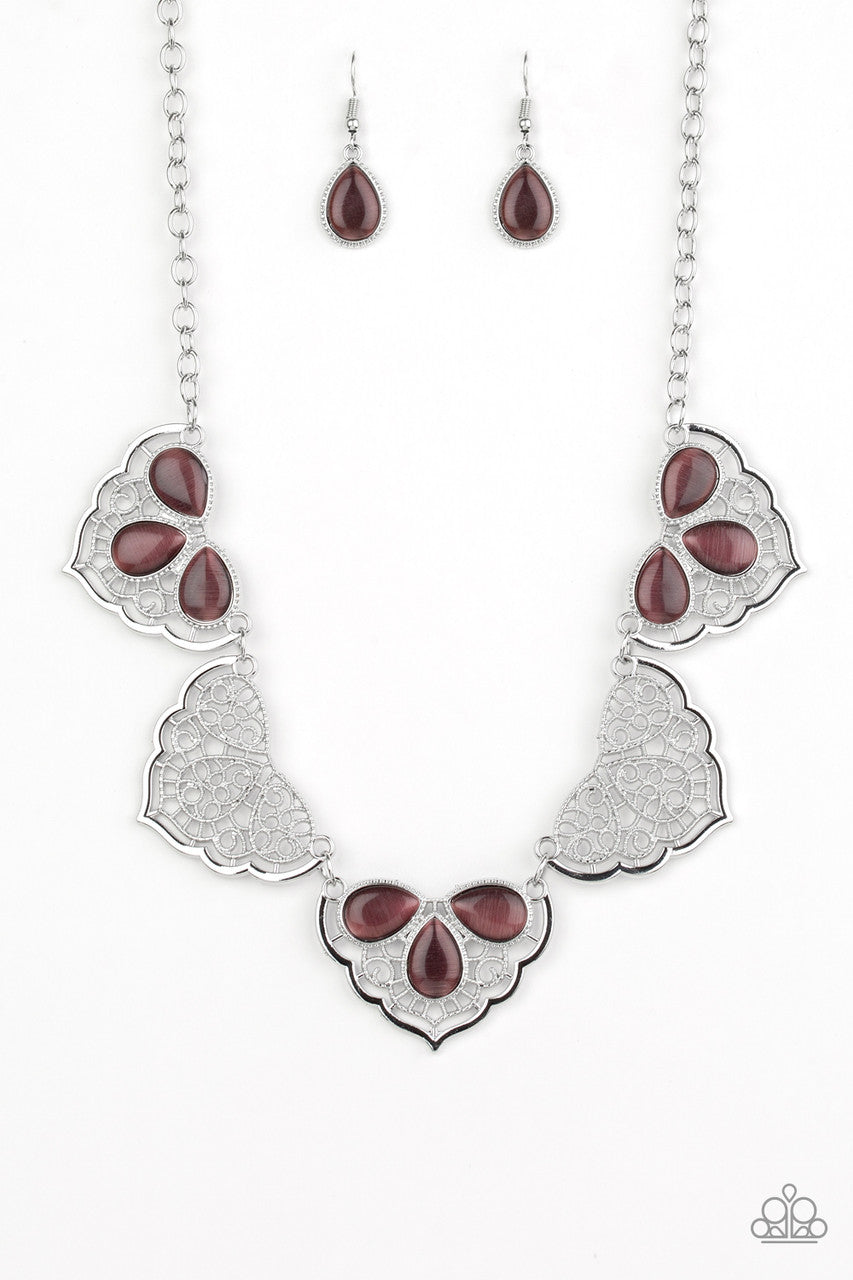 Filled with lacy-like patterns, filigree filled silver frames connect below the collar. Glowing purple teardrop moonstones alternate along the airy frames, adding a refreshing hint of color to the whimsical fringe. Features an adjustable clasp closure.