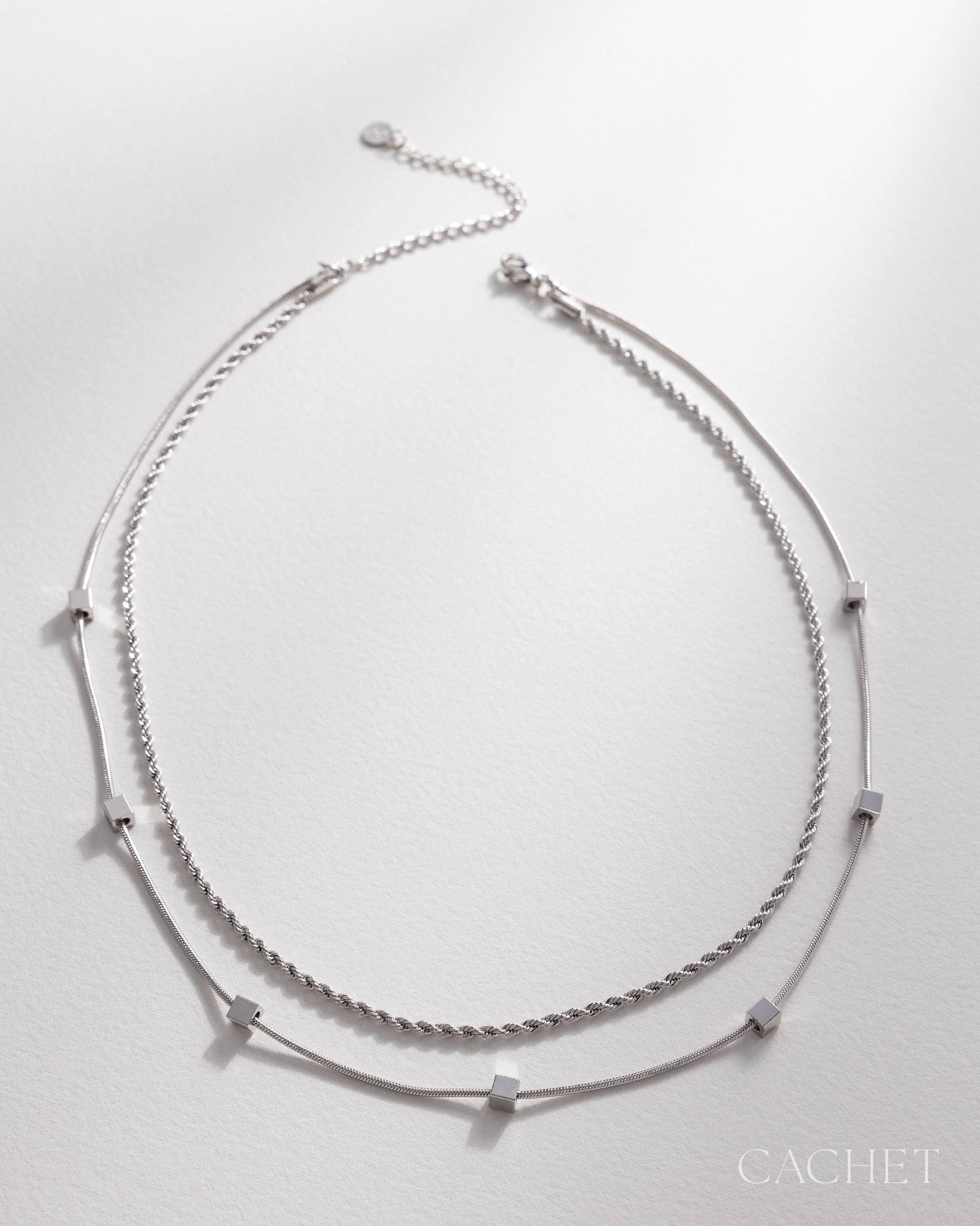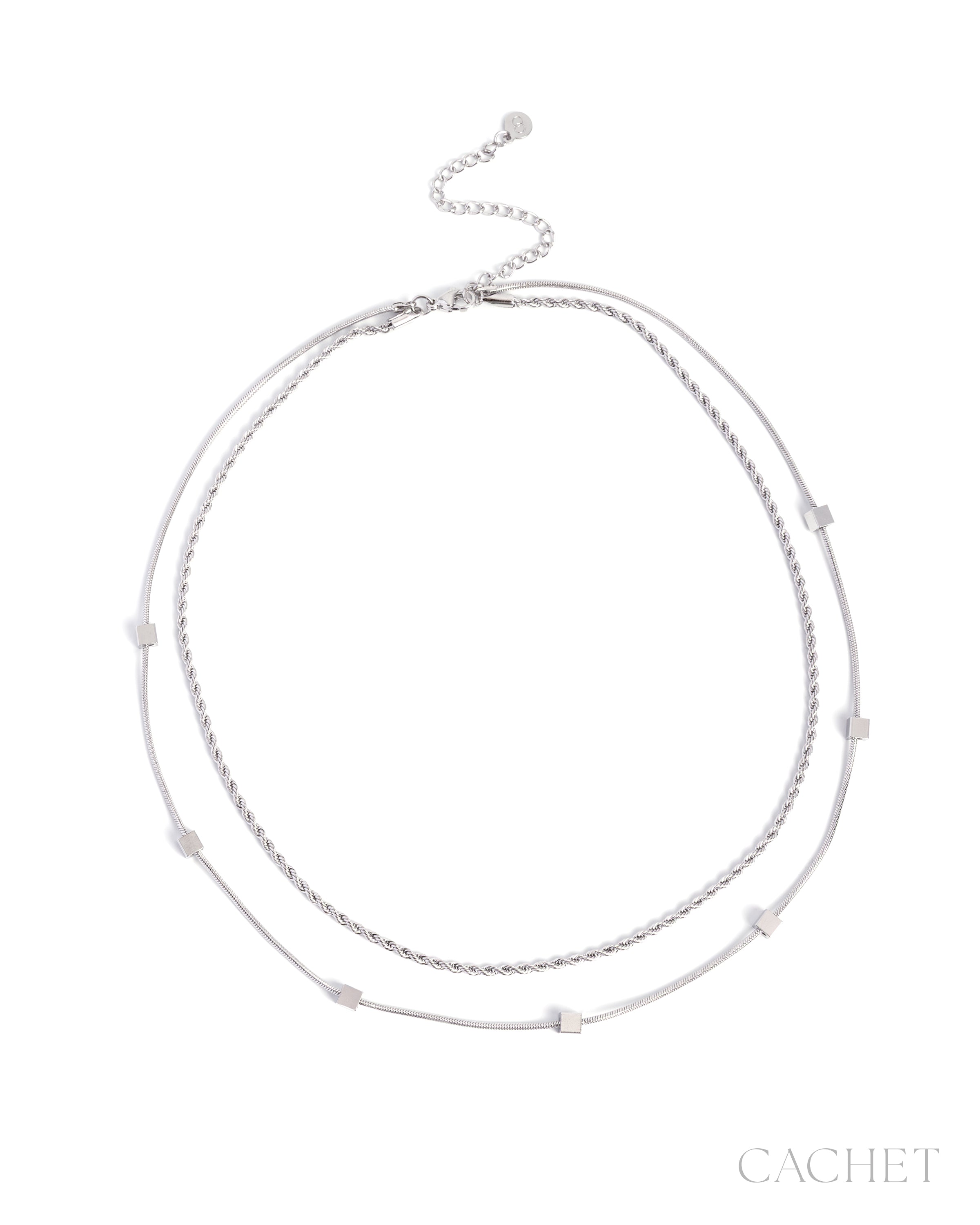 Like words shaped in grace, the necklace âEloquenceâ layers polished chains in contrasting textures and forms, each strand flowing with refined rhythm and quiet sophistication.
