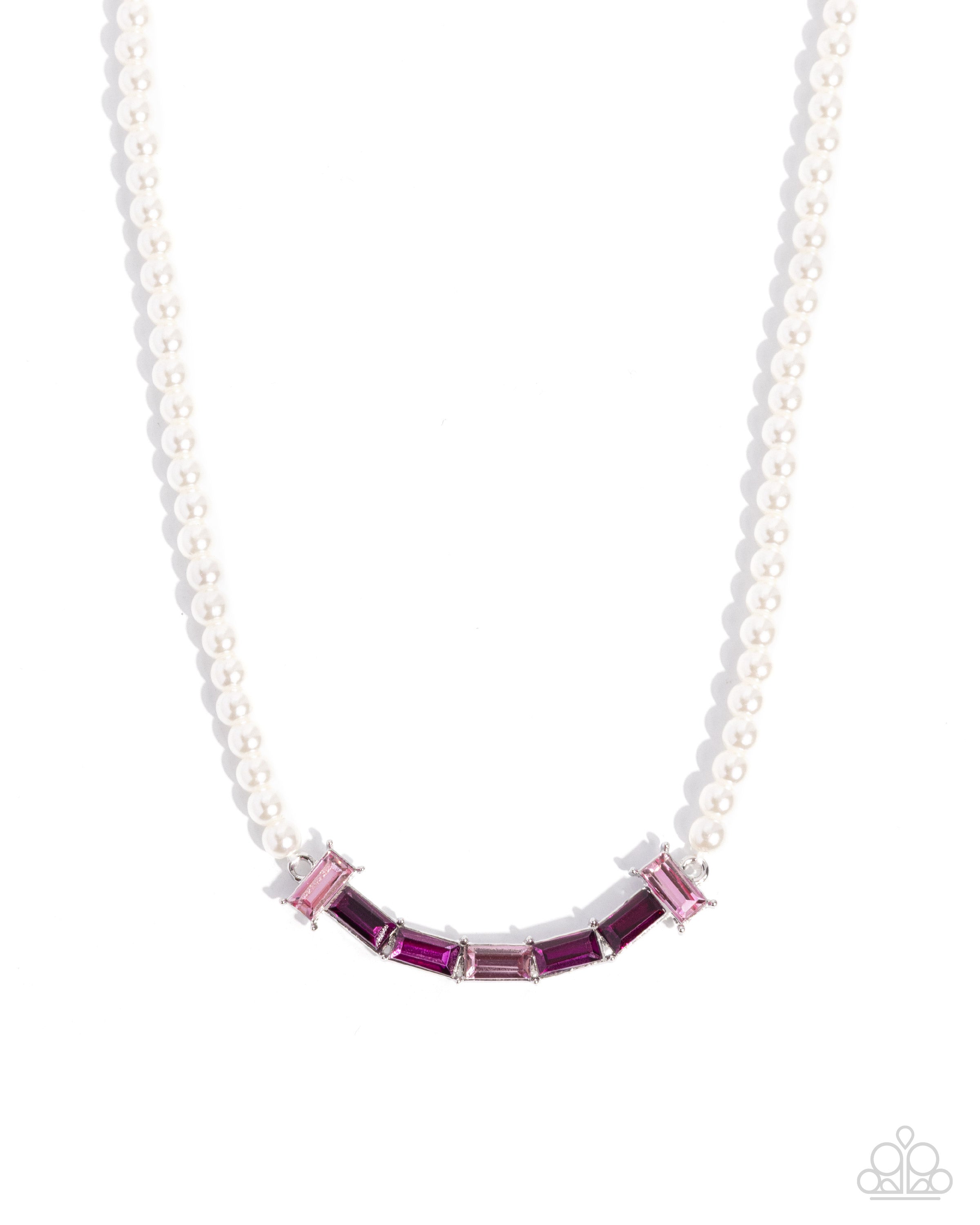 Encased in sleek silver-pronged fittings, faceted emerald-cut pink multicolored gems shimmer below the neckline from a polished collection of white pearls for a radiantly refined look below the neckline. Features an adjustable clasp closure.