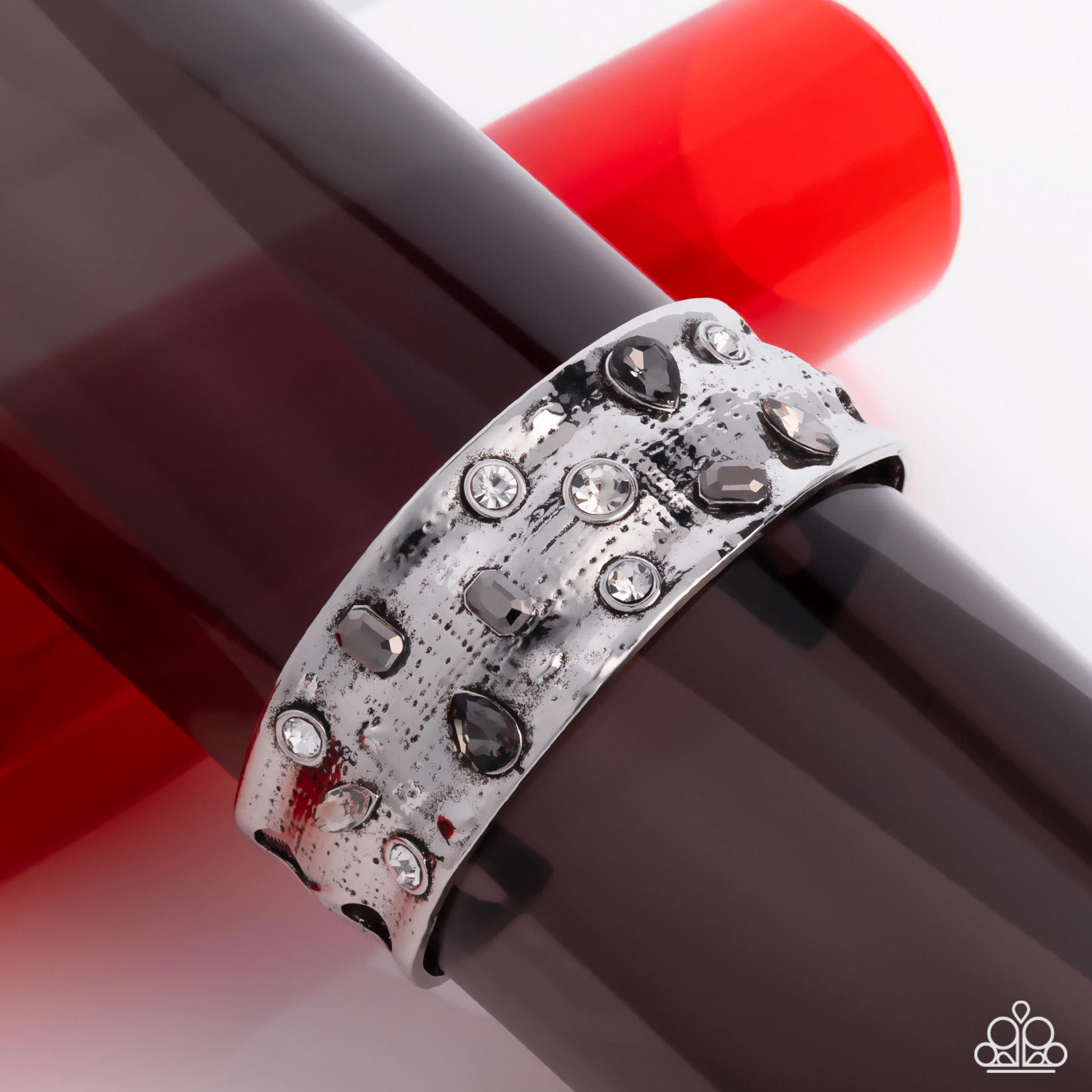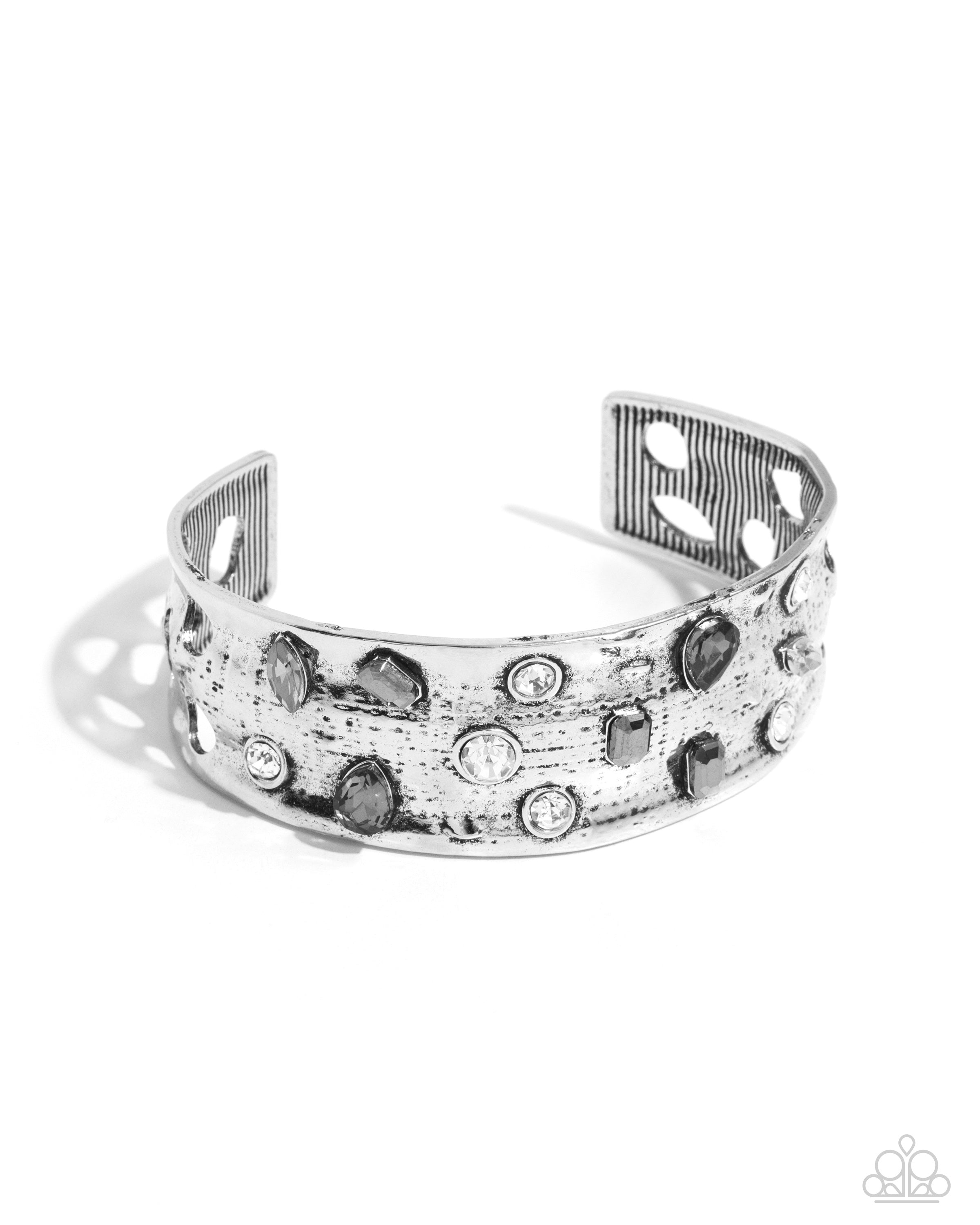 Scattered across the top of an antiqued, hammered, thick silver cuff, a collection of round, emerald-cut, and teardrop white, smoky, and hematite gems glitters atop the wrist for an elegant look.