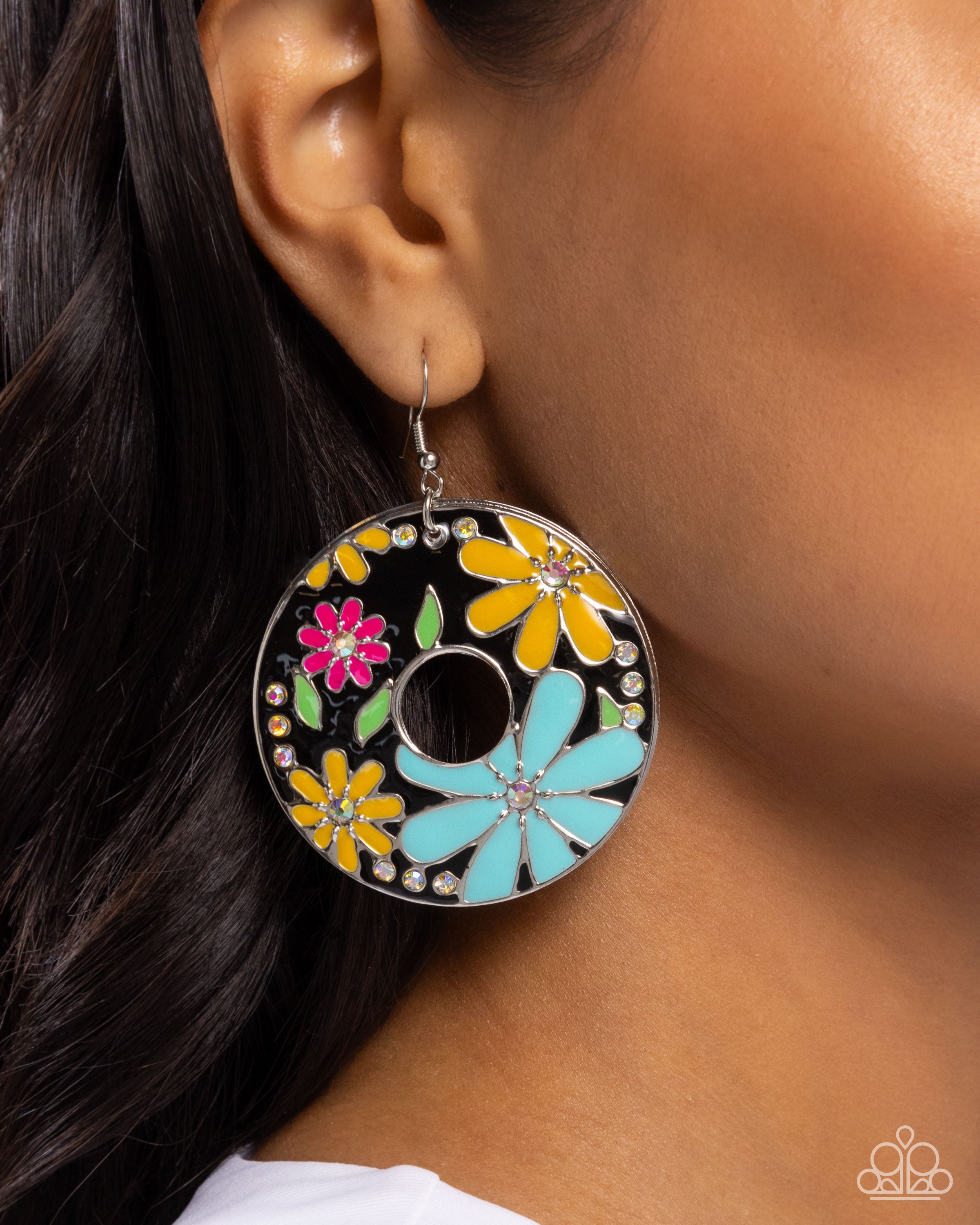 Featured atop a black-painted silver wreath, a collection of Classic Green leaves, a large tiffany flower, a dainty Pink Peacock flower, and Primrose flowers with iridescent and white rhinestone centers and details create an embroidery-inspired look below the ear. Earring attaches to a standard fishhook fitting. Due to its prismatic palette, color may vary.