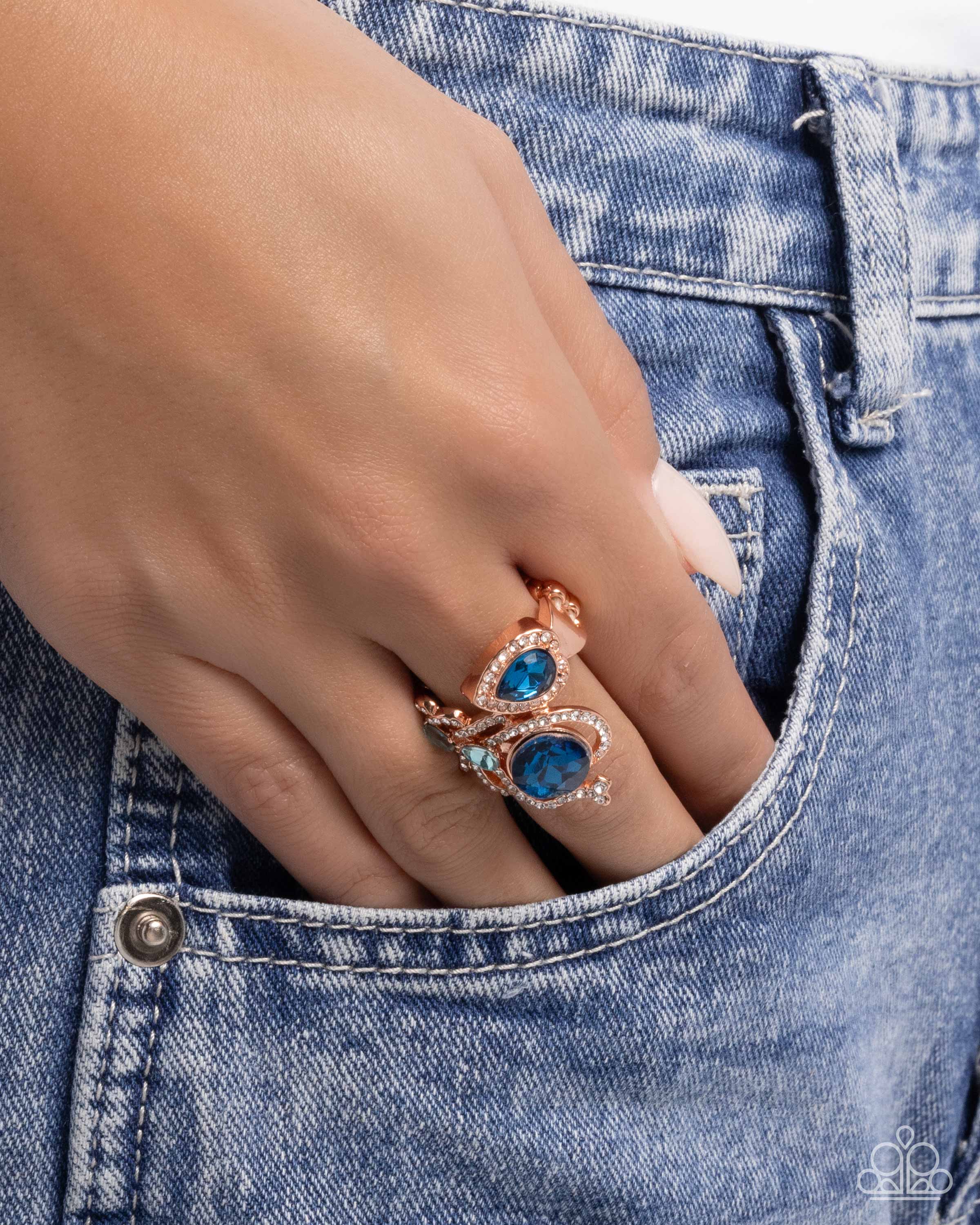 Featuring a dazzling display of elegance, a trio of faceted blue and light blue gems encased in shiny copper fittings coalesce atop the finger. A large round blue gem takes center stage, encircled by glittering white rhinestones, while a smaller teardrop-shaped blue gem and vibrant light blue accents add extra dimension and sparkle. Swirling shiny copper filigree completes the bold and colorful design. Features a stretchy band for a flexible fit.