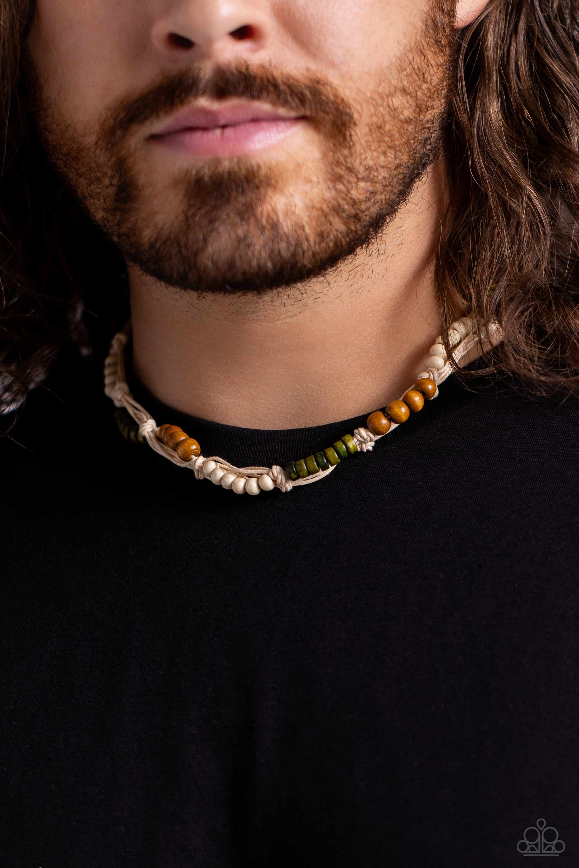 Sections of brown, green, and white wooden beads create loops at the bottom of knotted white cords, resulting in a colorfully earthy palette below the collar. Features a button loop closure.