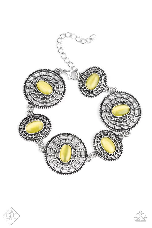 Dotted with glowing yellow cat's eye accents, a collection of vintage-inspired silver frames connect across the wrist. The ornate oval casings swirl with studded patterns and vine-like filigree for a seasonal flair. Features an adjustable clasp closure.