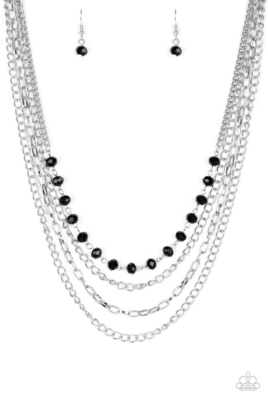 Mismatched silver chains layer down the chest. A strand of faceted black gems join below the collar for a glamorous look. Features an adjustable clasp closure.