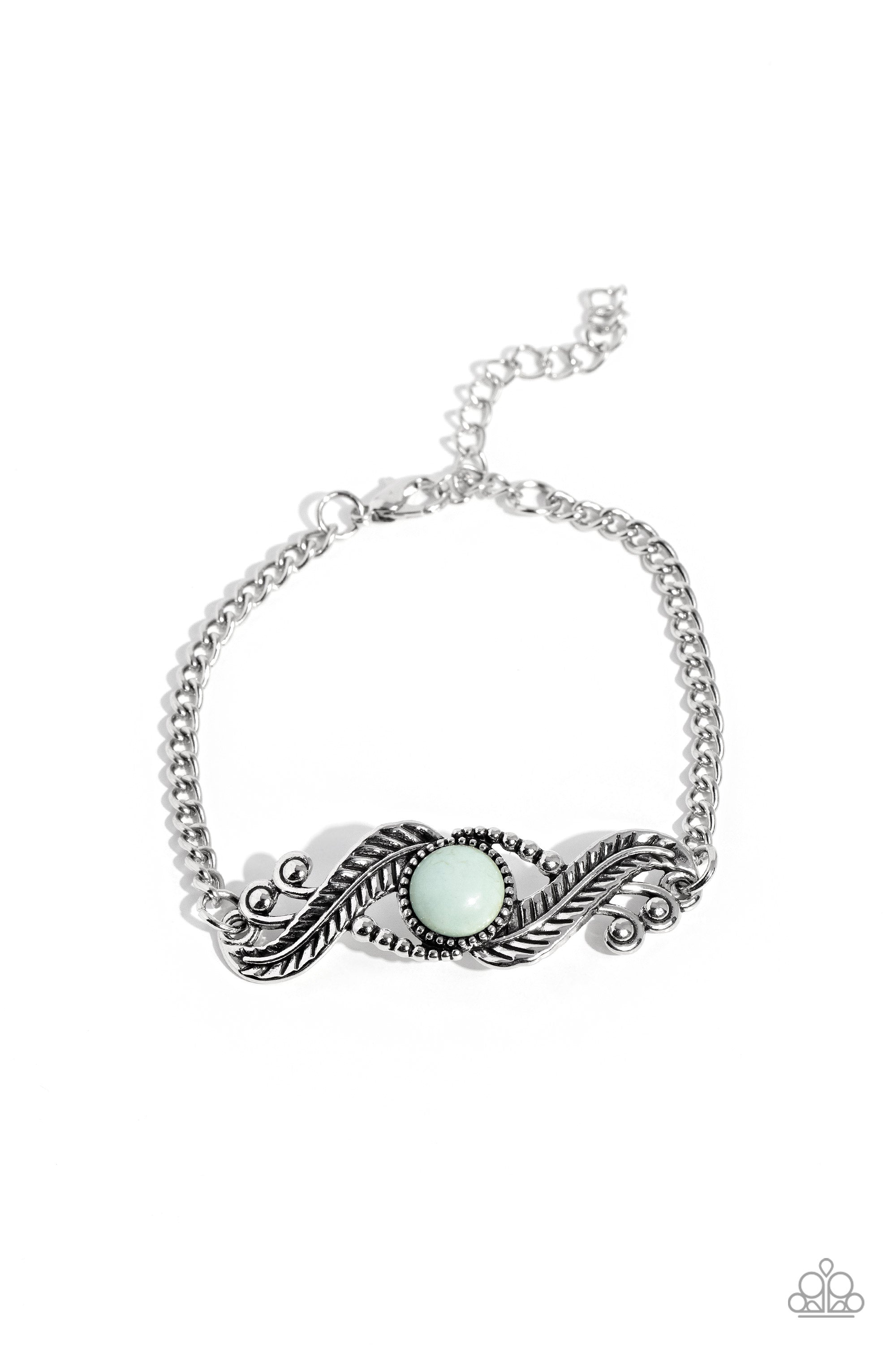 Ornate, elongated silver feathers fan out from a light blue stone center. Silver studs curl around the stony centerpiece, as well as the feathers, for a Southwestern style. Additional curls of silver, with studs in its center, grace the eye-catching pendant around the wrist. Features an adjustable clasp closure. As the stone elements in this piece are natural, some color variation is normal.