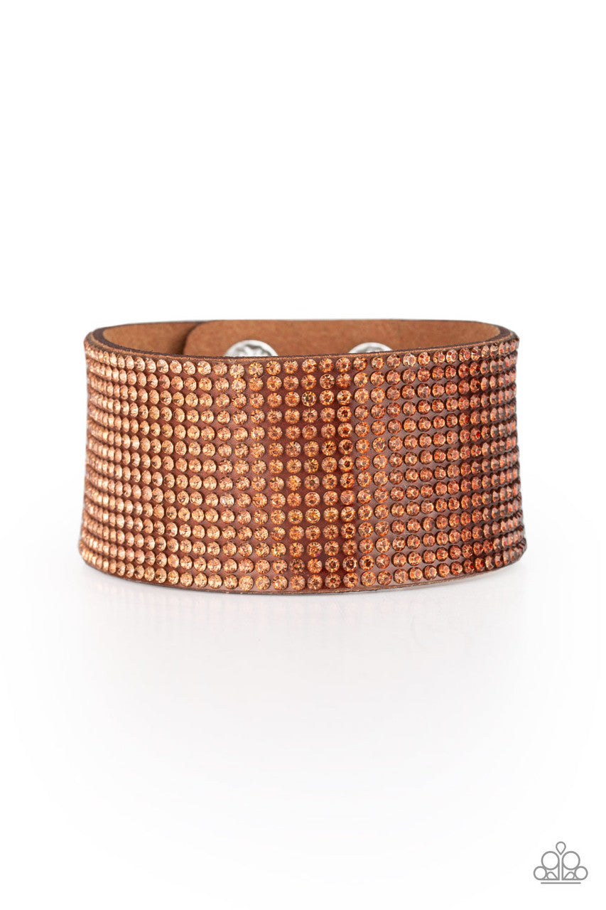 Row after row of glassy rhinestones gradually fade from golden topaz to dark topaz across the front of a thick brown suede band for a trendy ombre look. Features an adjustable snap closure.
