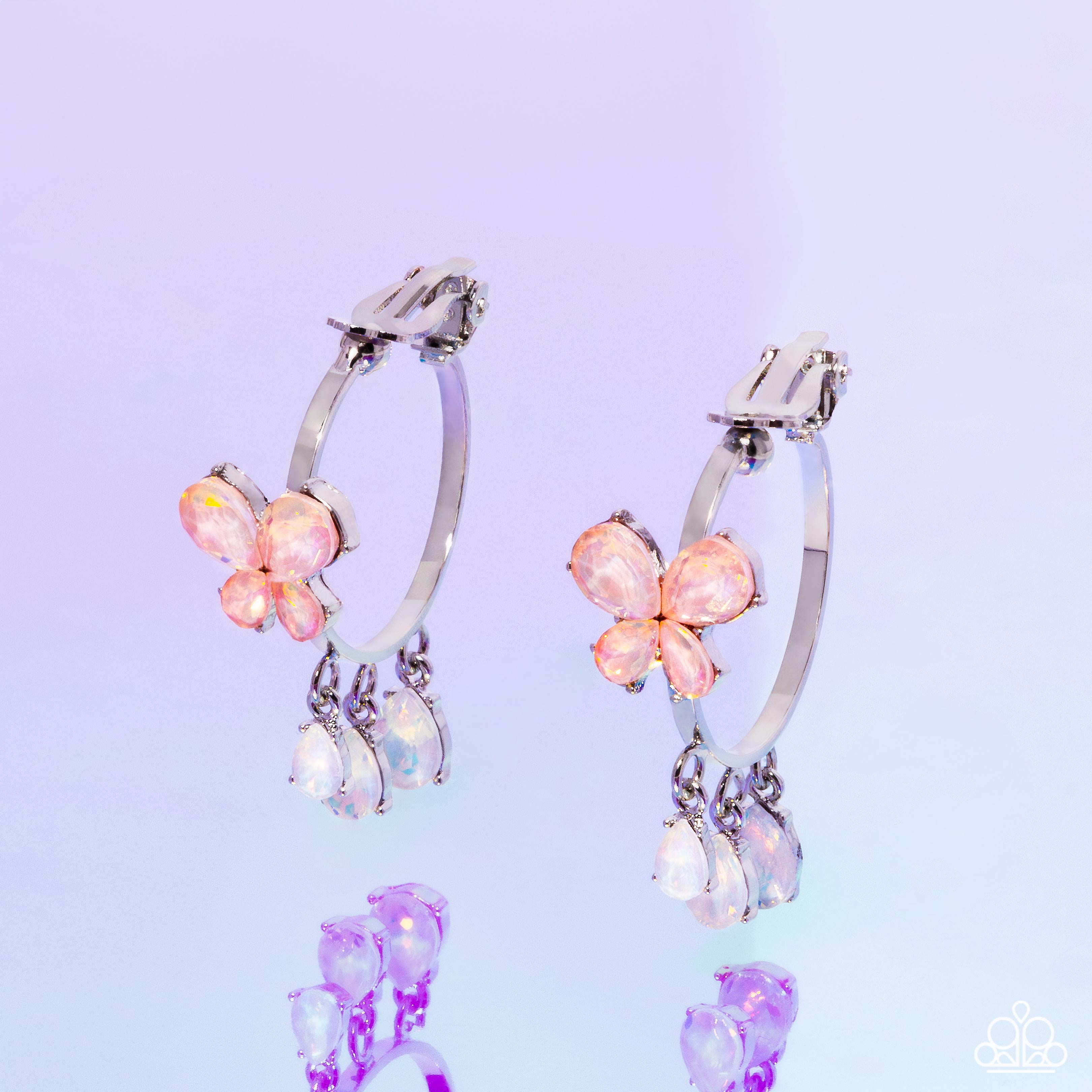 Featuring an opalescent shimmer, an orange gem teardrop butterfly flutters along the center of a thin silver hoop for a whimsical display. A trio of white opalescent gem teardrops swings freely from the bottom of the hoop gradually increasing in size, resulting in a melodic finish. Earring attaches to a standard clip-on fitting.