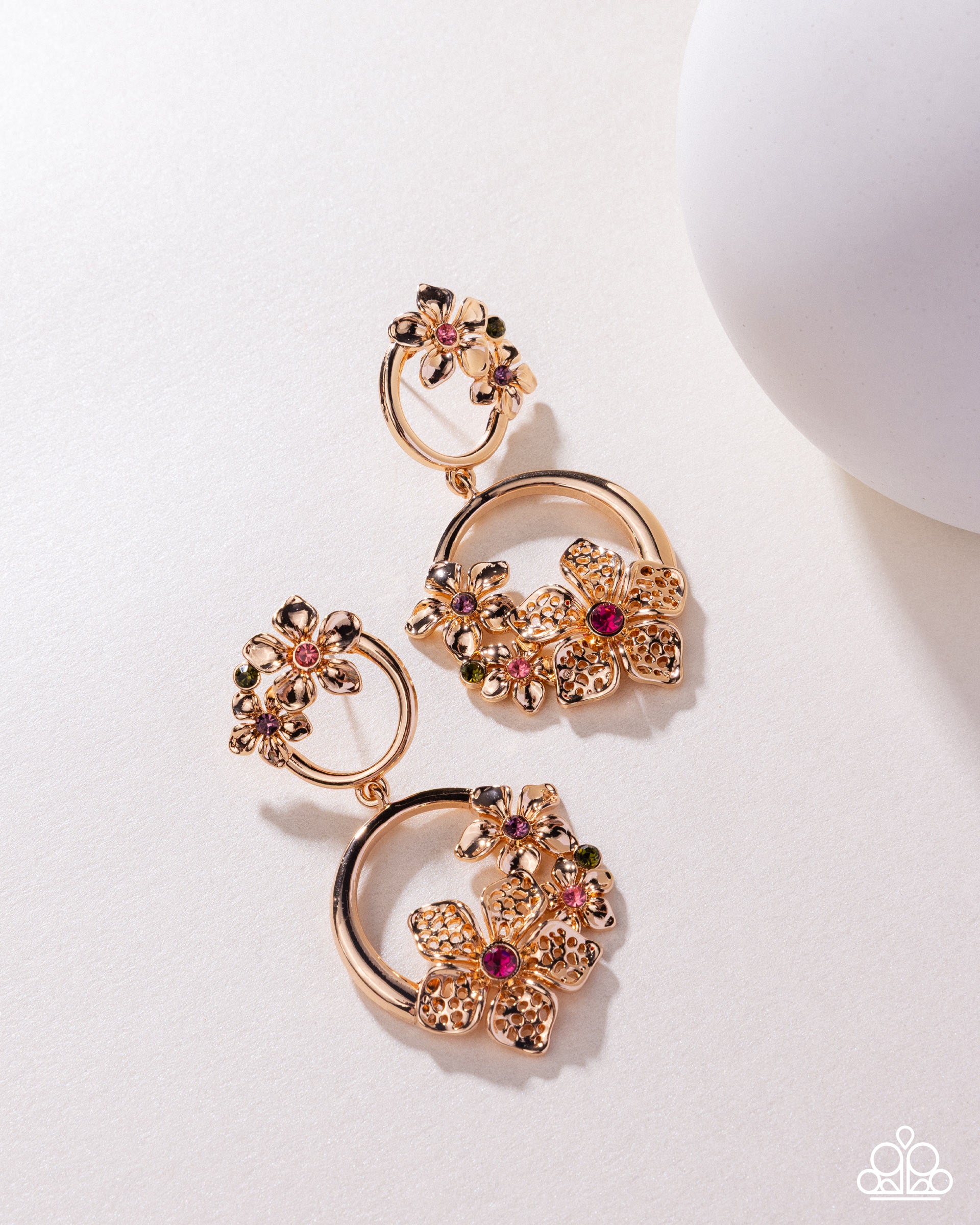 Encrusted along the curve of a dainty gold hoop, a vivacious collection of gold flowers with rose rhinestone centers bloom next to a solitaire olive rhinestone, giving way to a larger gold hoop with the same flowers except the largest flower has airy textures and two of the flowers feature light-colored amethyst and fuchsia centers for additional light-catching whimsical attention. Earring attaches to a standard post fitting.