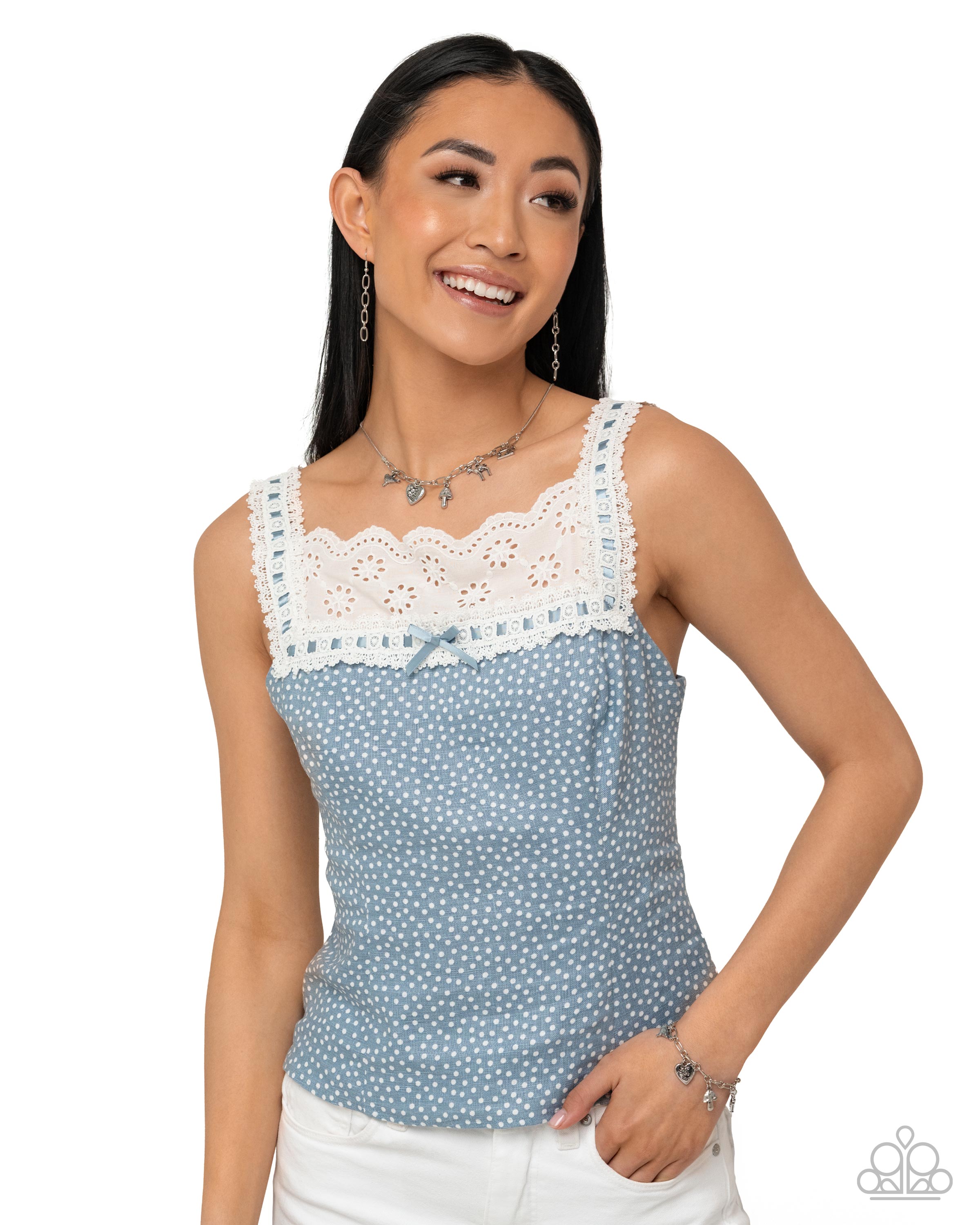 Connecting to a silver snake chain, a strand of silver paperclip chain coalesces along the center of the neckline. Swaying along the paperclip chain links, a collection of silver whimsical charms including a bird, a cottage, a spotted mushroom, a deer, and a heart pendant stamped with a whimsical motif cascades for a fairytale-inspired finish. Features an adjustable clasp closure.