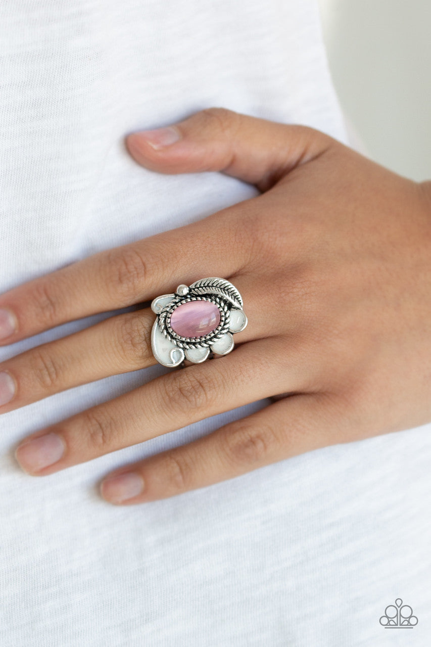 A glowing pink cat's eye stone is pressed into the center of a shimmery silver frame radiating with a silver feather and glistening white petals, creating a whimsical compilation atop the finger. Features a stretchy band for a flexible fit.