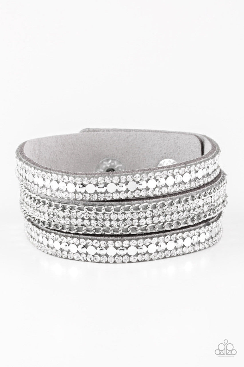 Rows of flat silver discs, glassy white rhinestones, and shimmery silver chains are encrusted along gray suede bands for a sassy look. Features an adjustable snap closure.