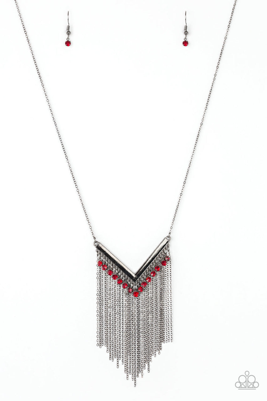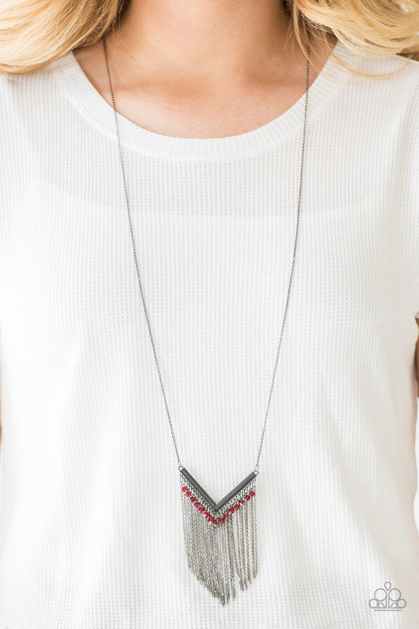Shimmery gunmetal chains cascade from the bottom of a V-shaped frame, creating a gorgeously tapered fringe. Swinging from the bottom of a lengthened gunmetal chain, the edgy frame gives way to glittery red rhinestones for a refined finish. Features an adjustable clasp closure.