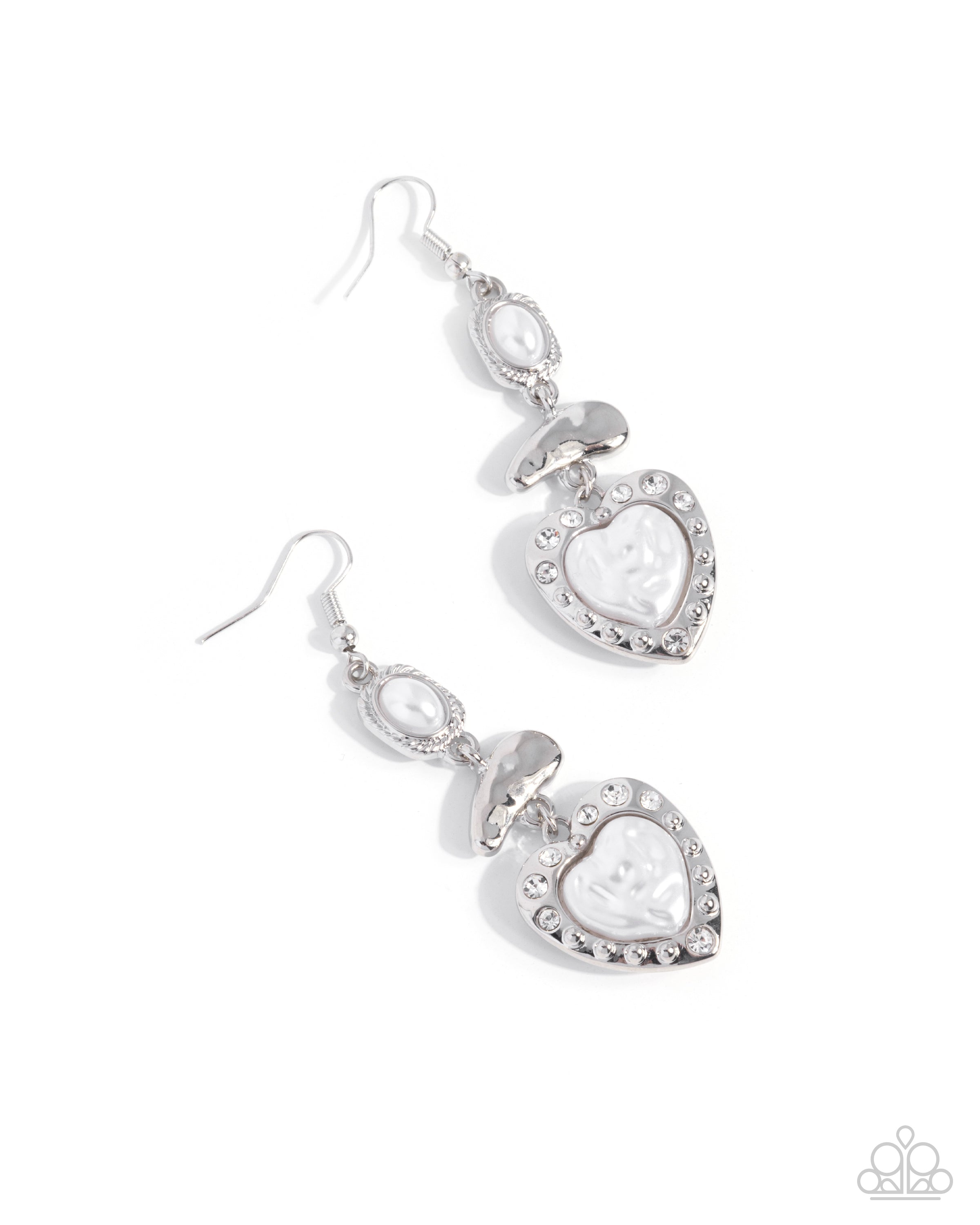 Pressed in a textured silver frame, an oval white pearl gives way to a hammered abstract silver bar, which then gives way to an oversized silver heart, adorned with a lustrous baroque pearl center and bordered by dazzling white rhinestones and silver studs, creating a whimsical romantic lure. Earring attaches to a standard fishhook fitting.
