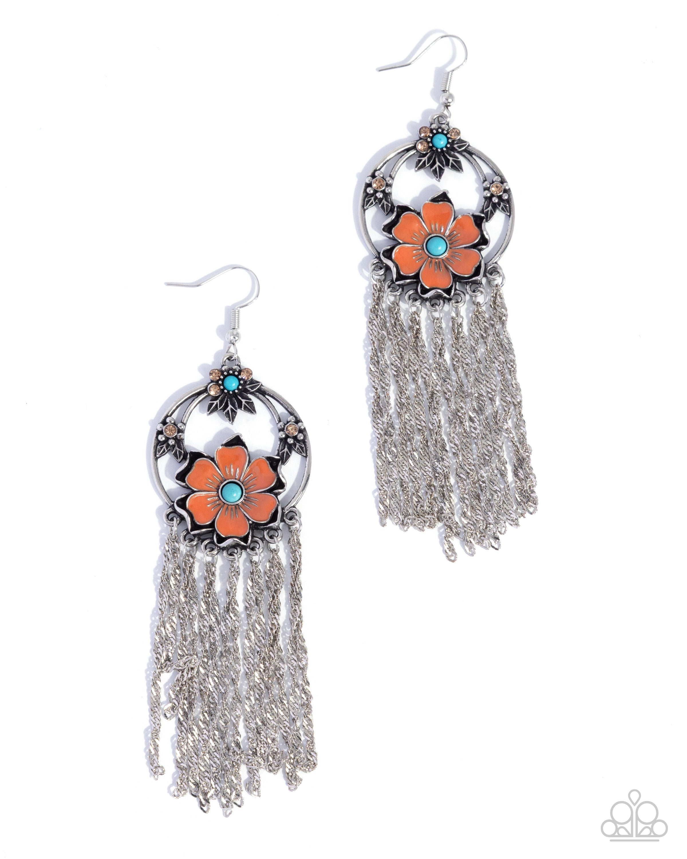 Featuring light-colored topaz rhinestones and round turquoise stones, a collection of whimsical leaves sporadically dots along a layered silver hoop, leading the eye to a Brandied Melon-painted three-dimensional silver flower with a turquoise stone center. Classic and Singapore silver chains stream from the bottom of the floral fitting for a free-spirited, flashy finish. Earring attaches to a standard fishhook fitting. As the stone elements in this piece are natural, some color variation is normal.