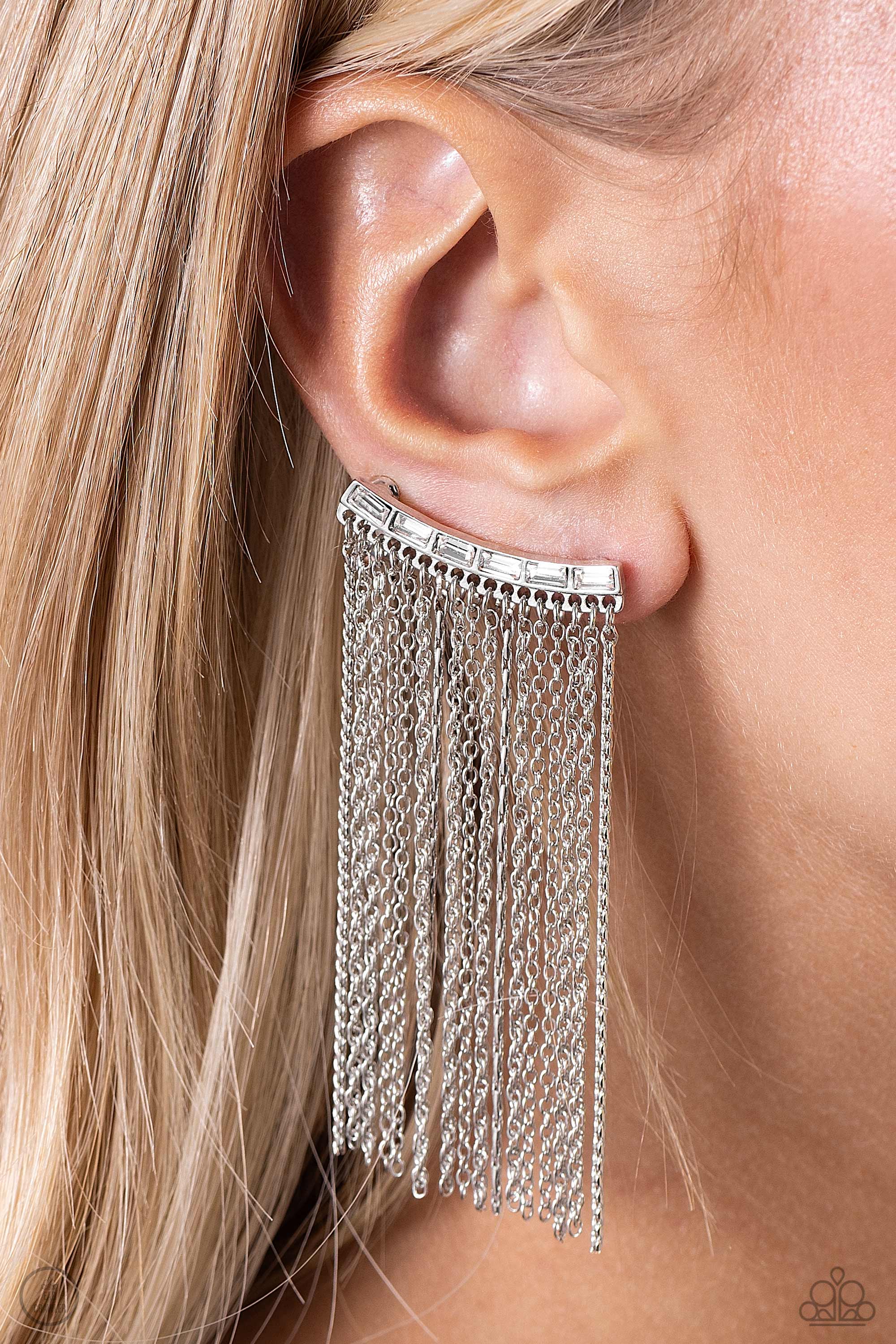A tapered fringe of mismatched dainty silver chains cascades from the edge of a curving white emerald-cut gem-encrusted frame, creating an edgy centerpiece atop the ear. Features an extended post fitting that climbs the back of the ear and can be pressed together for a more secure fit.