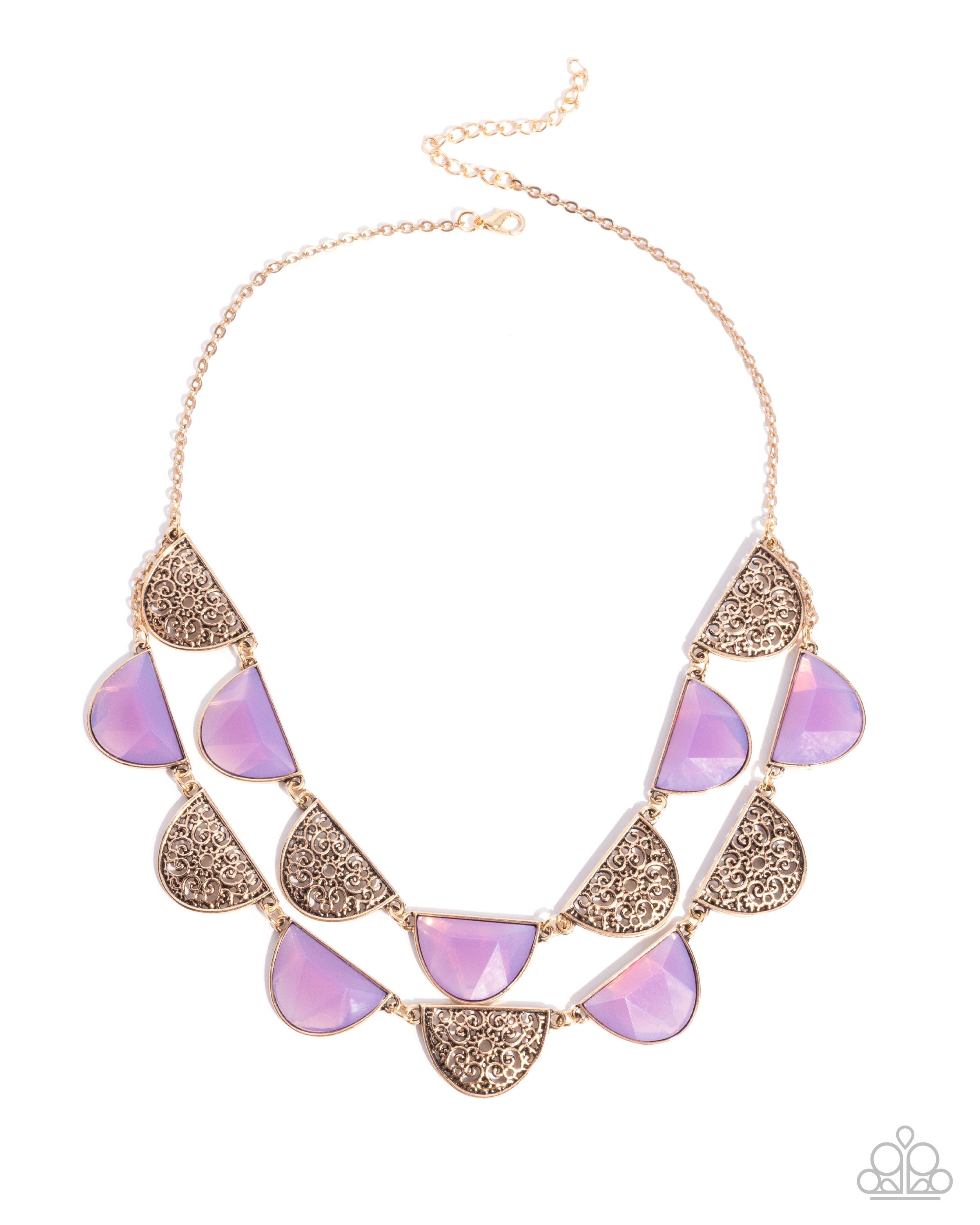 Connecting to a dainty antiqued gold chain, a collection of sun-swirled antiqued gold filigree semicircle pendants alternate with faceted purple acrylic semicircles for a layered luminescent display. Features an adjustable clasp closure.