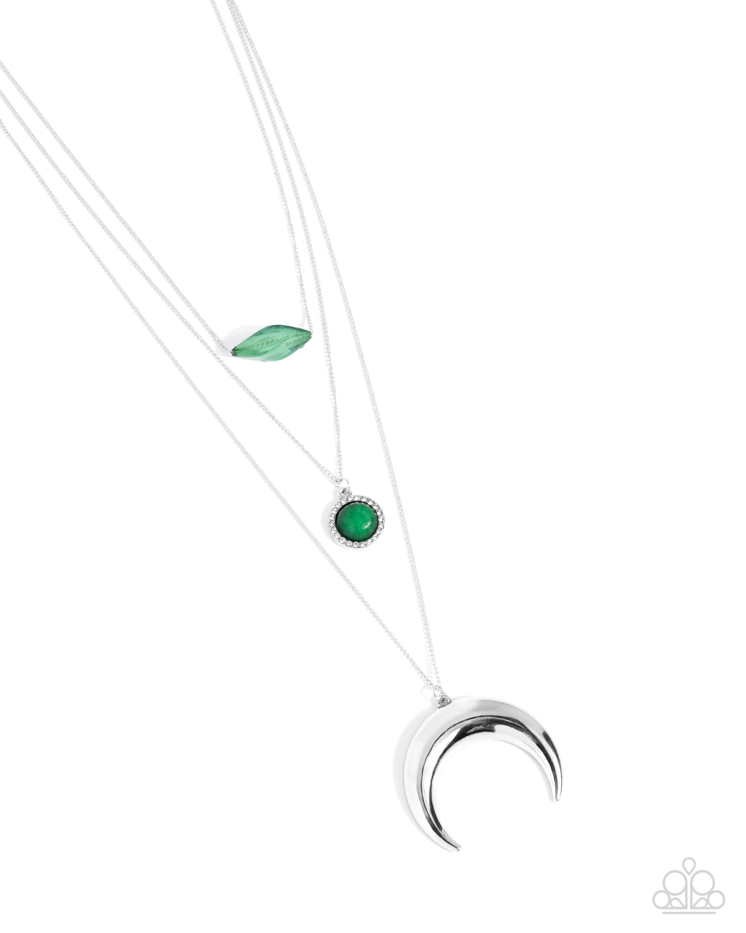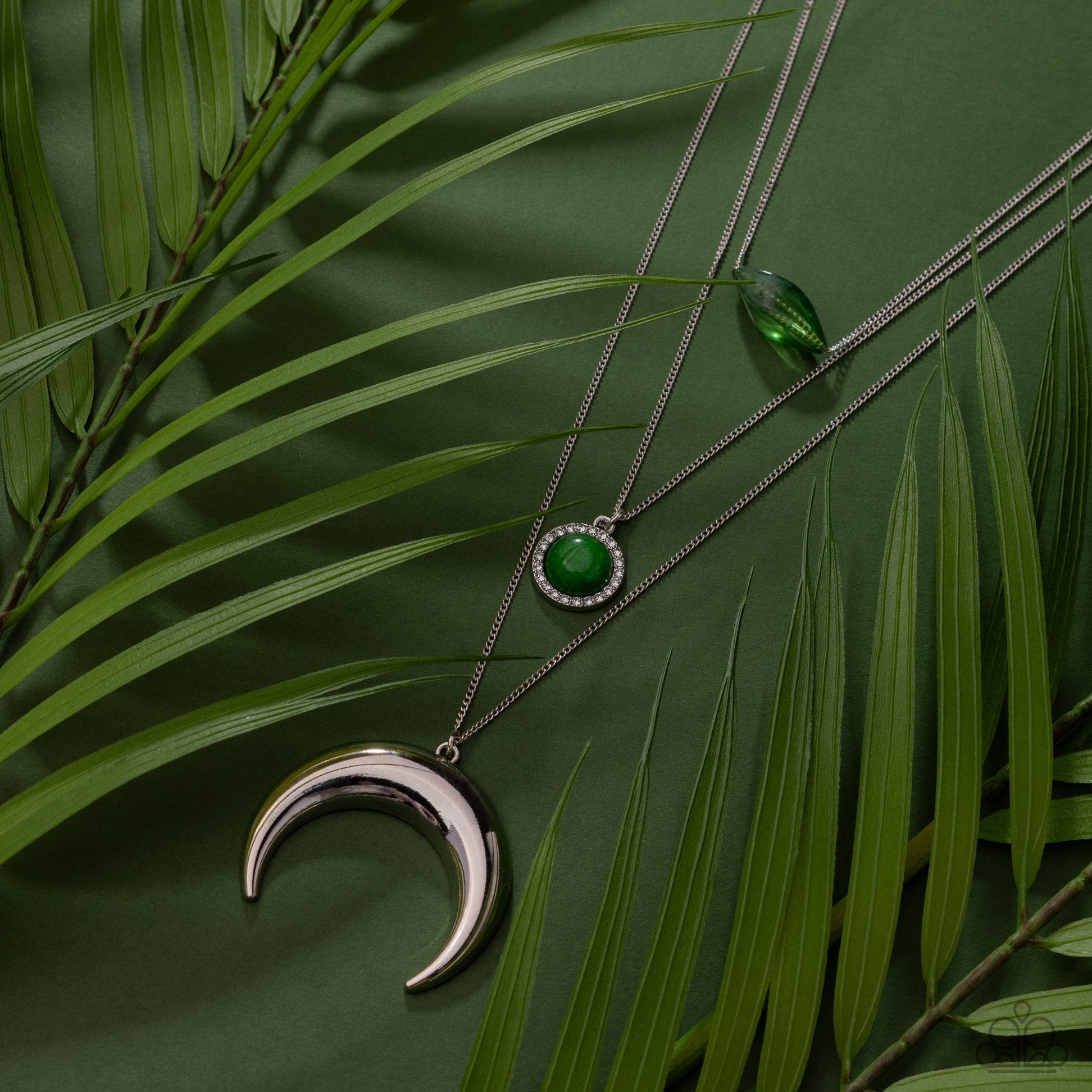 Three free-spirited charms, including a jade abstract bead, a jade stone in a white rhinestone border, and a silver crescent horn cascade below the neckline from dainty silver chains in layers for a mesmerizing display. Features an adjustable clasp closure. As the stone elements in this piece are natural, some color variation is normal.