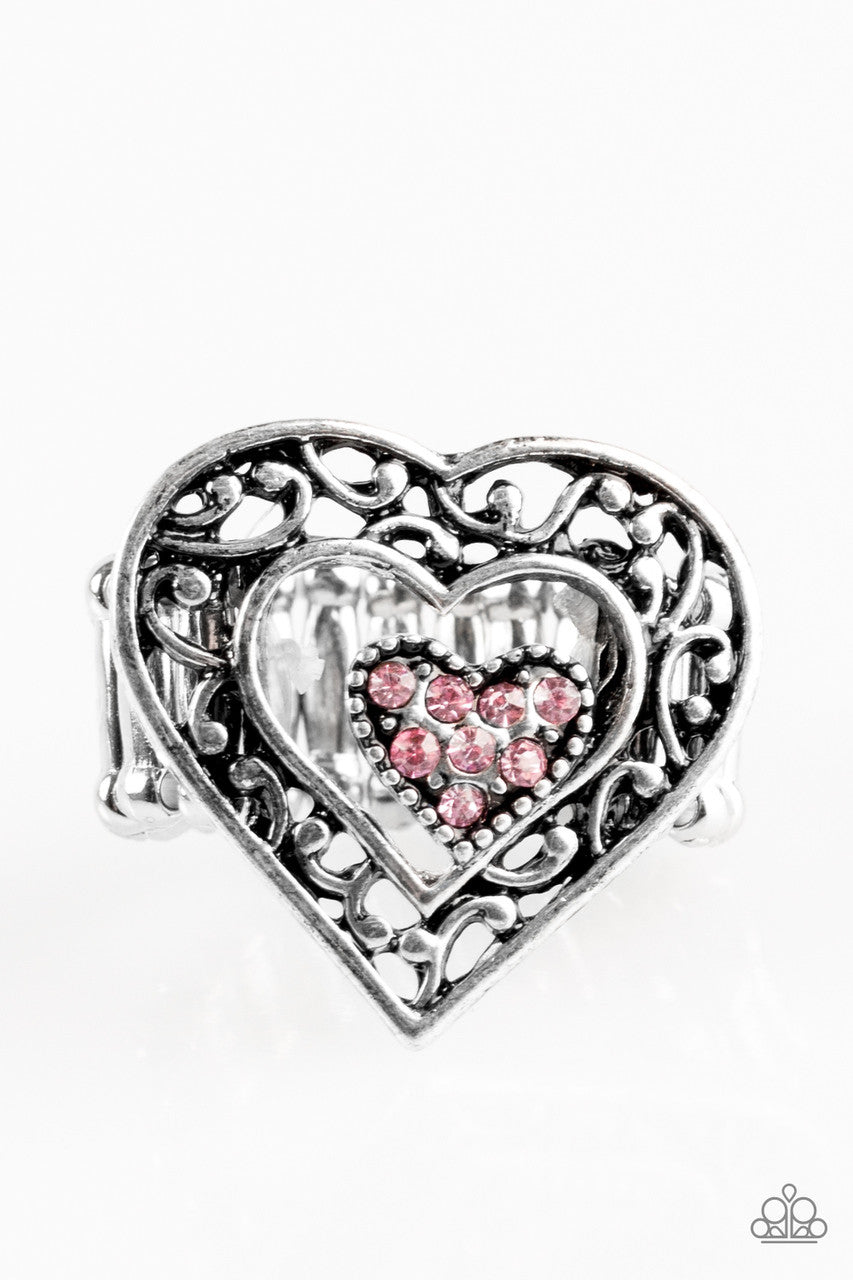 Shimmery silver filigree climbs a heart-shaped frame in a vintage inspired fashion. Encrusted in glittery pink rhinestones, a dainty silver heart sits off center inside the frame for a refined finish. Features a stretchy band for a flexible fit.