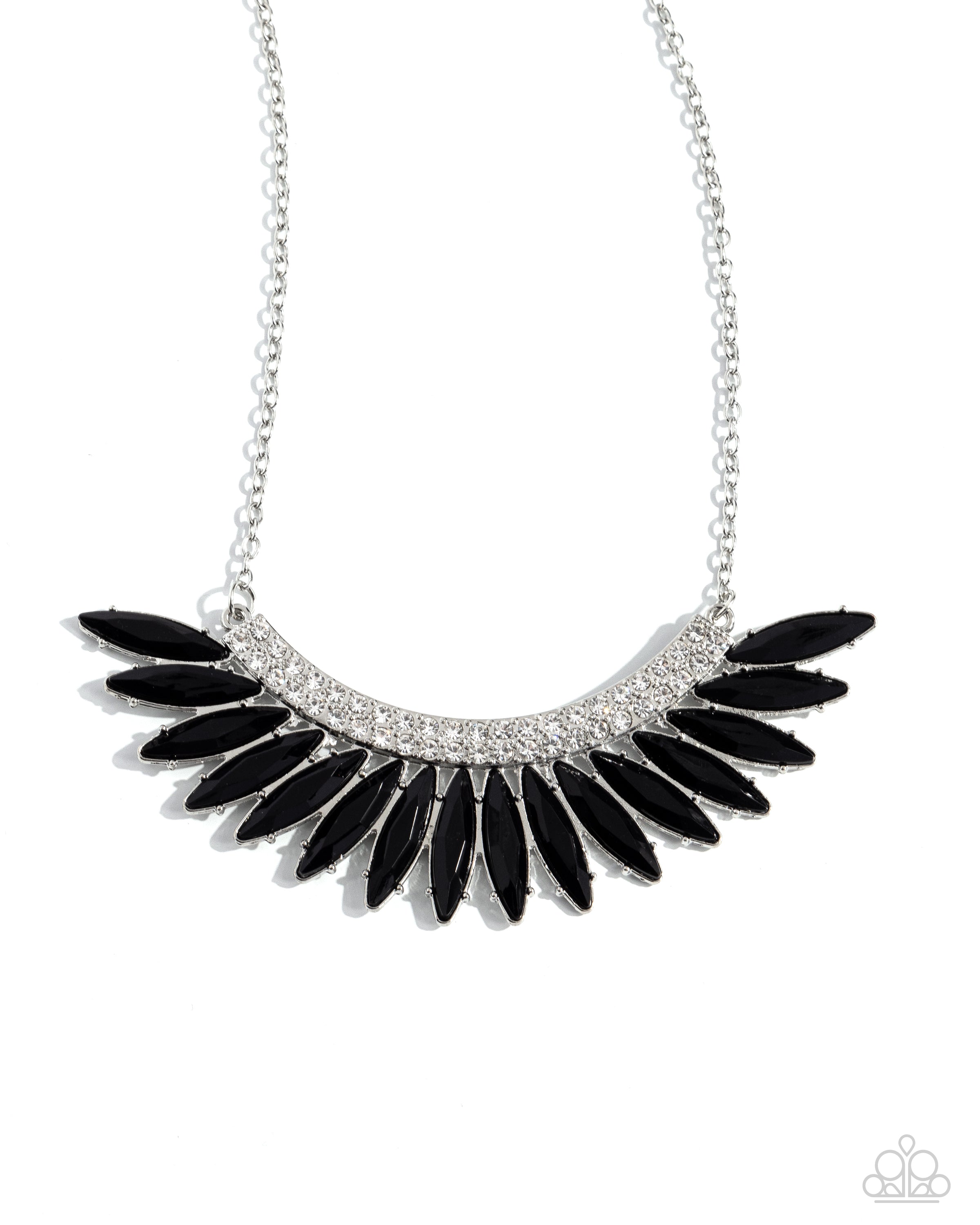 A faceted row of marquise cut black beads fans out from the bottom of a curved silver frame extravagantly embellished in glassy white rhinestones, coalescing in a flauntable centerpiece below the collar. Features an adjustable clasp closure.