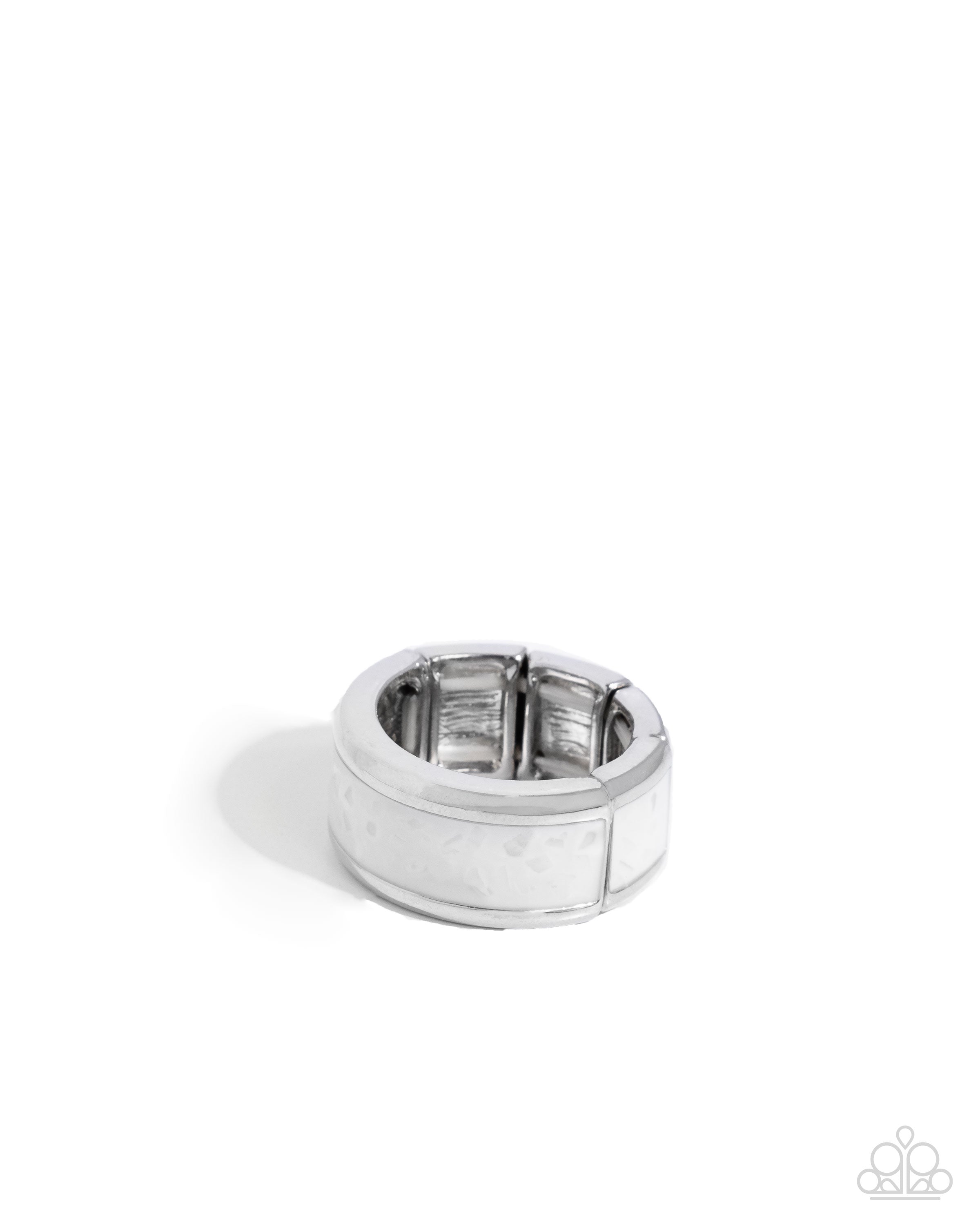 Featuring a white-painted backdrop, flecks of white shell sporadically dot the front of a sleek silver band for a subtle pop of eye-catching color and glitz. Features a stretchy band for a flexible fit.