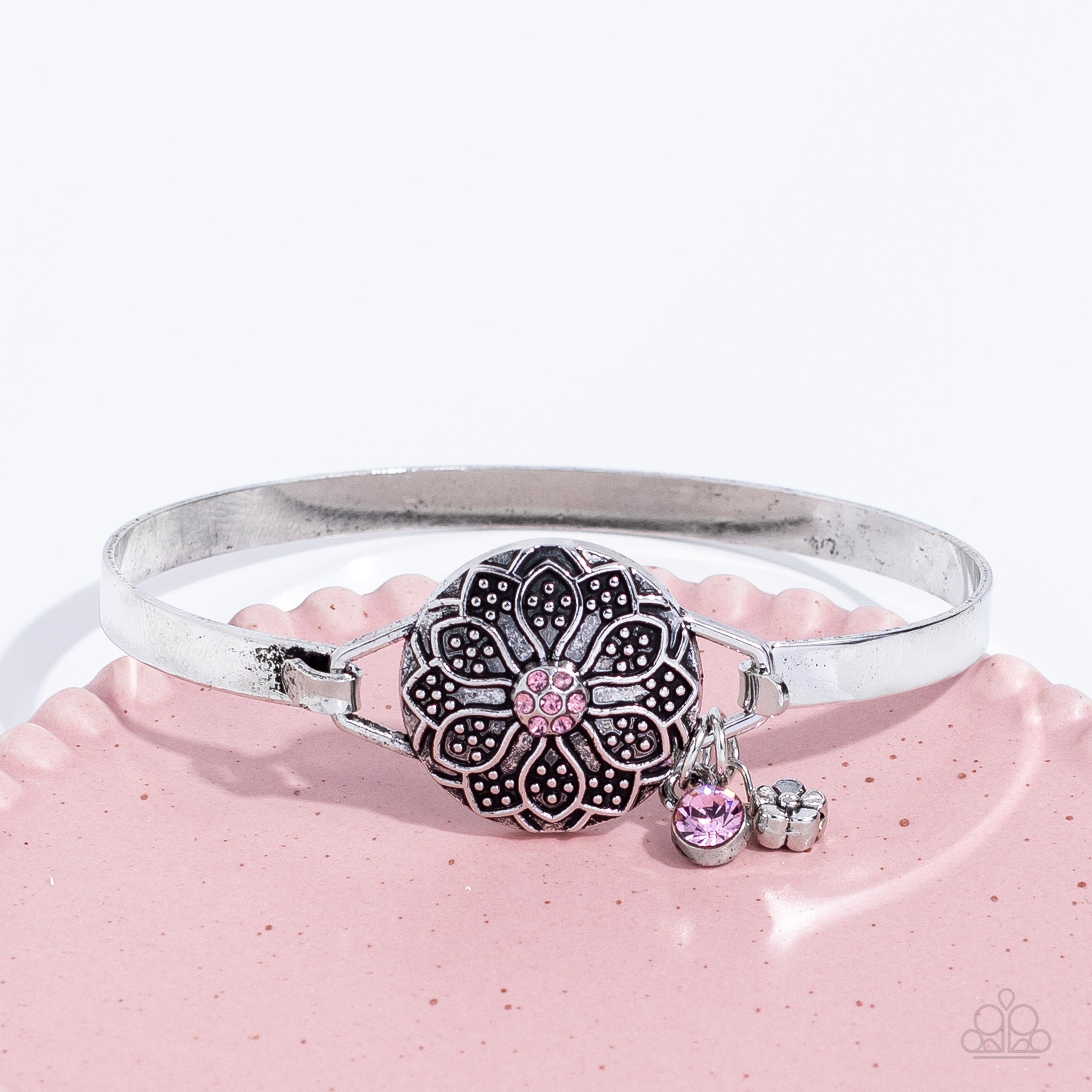 Studded silver petals bloom out from a dainty Gossamer Pink rhinestone center, blooming into an embossed floral frame that hinges to the center of a dainty bangle-like bracelet. A dainty silver flower and Gossamer Pink rhinestone accent dangles from the flowery centerpiece, adding playful movement to the whimsical display. Features a hinged closure.