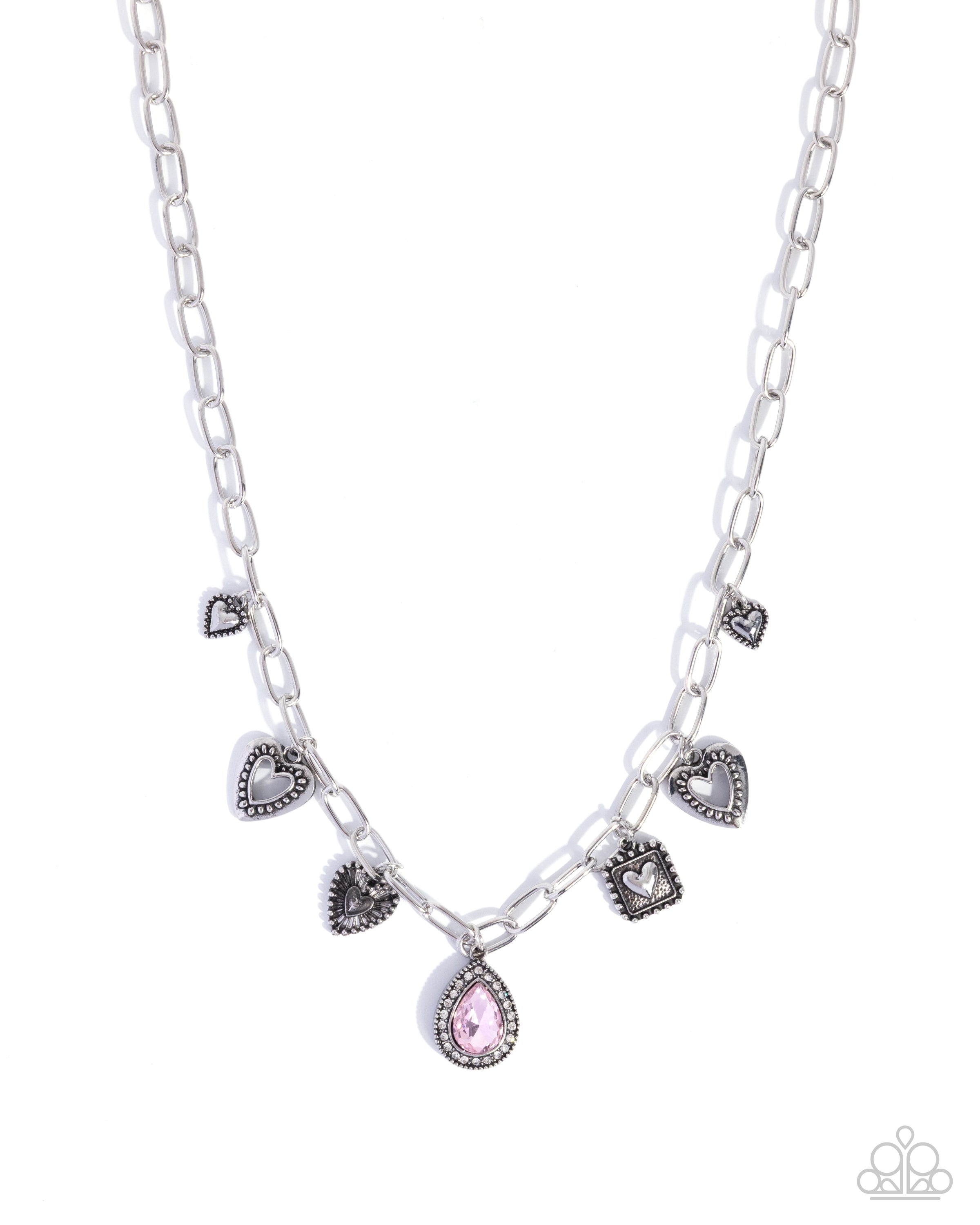 Featuring studded borders and sunburst motifs, a collection of various silver heart charms and a solitaire pink teardrop gem surrounded by dainty white rhinestones patterns below the neckline along a silver cable chain for a flirtatiously, eye-catching display. Features an adjustable clasp closure.