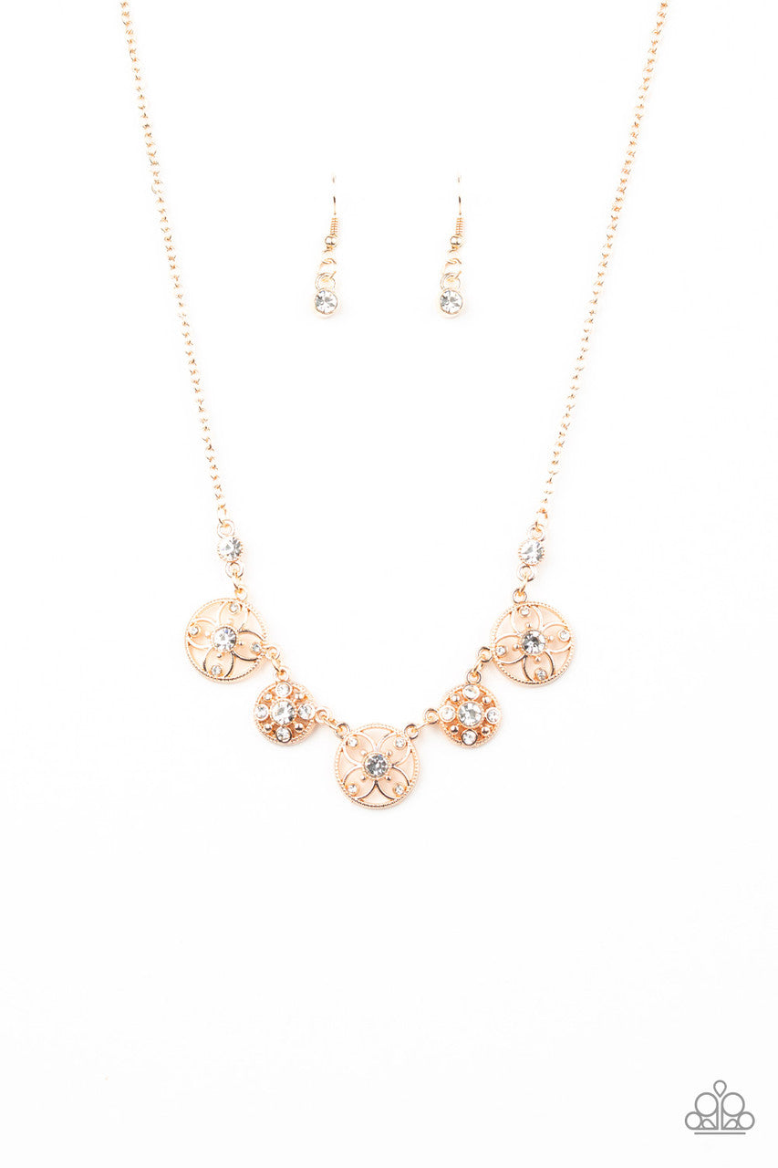 Dotted with glittery white rhinestones and dainty rose gold studs, flowery medallion-like frames link below the collar for a whimsical look. Features an adjustable clasp closure.