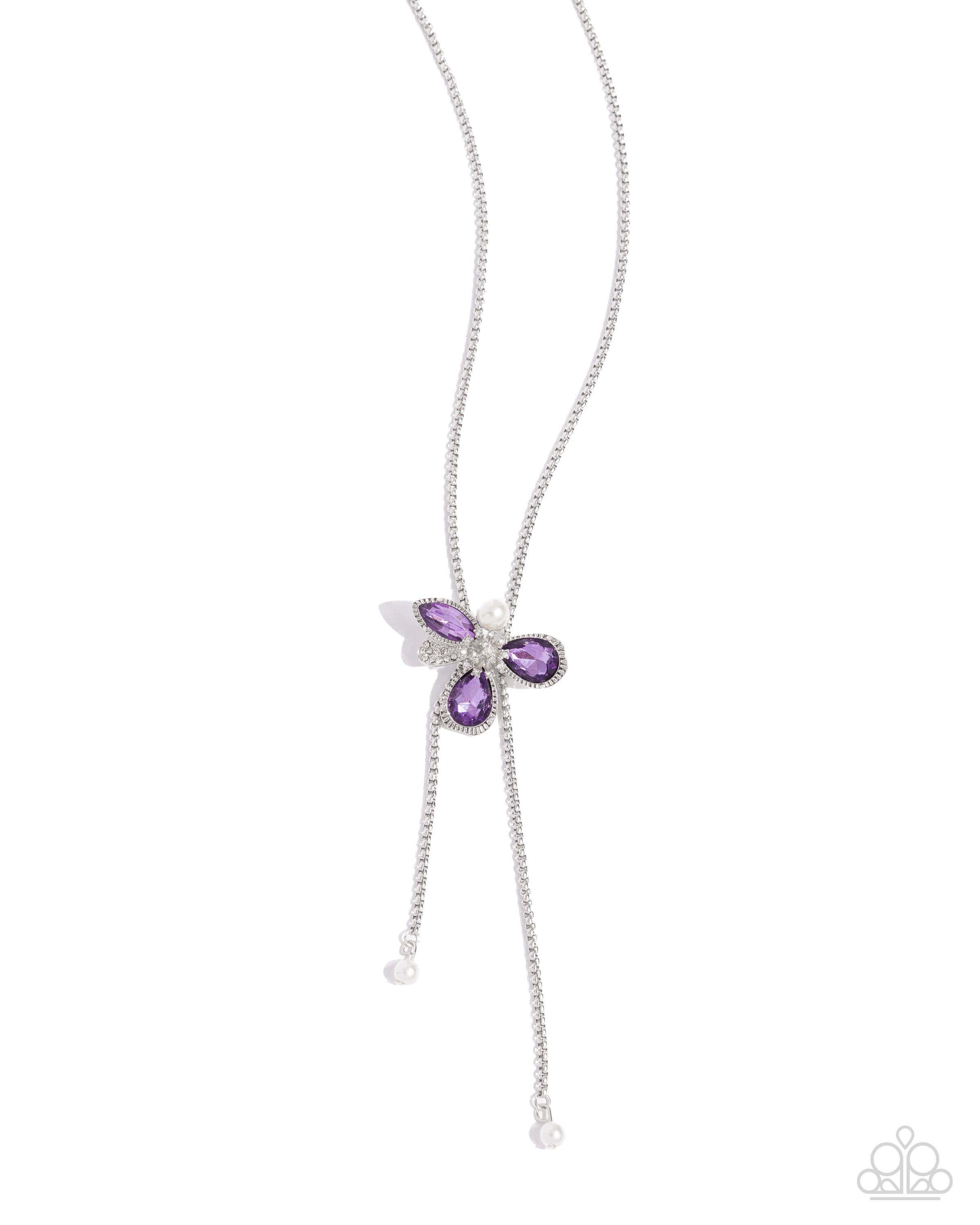 Anchored along a looped silver box chain, an abstract silver flower, featuring teardrop and marquise-cut purple gems, white rhinestones, and white pearl petals flutters for a whimsically adjustable centerpiece. Additional dainty white rhinestones create realistic anther-inspired dazzle from a silver filament center while glossy white pearls cap the ends of the silver chain for a refined finish. Features a bolo closure.